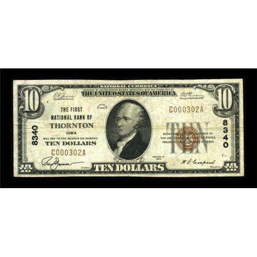 <B>Thornton, IA</B></I> - $10 1929 Ty. 1 <B>The First NB</B></I> Ch. # 8340<BR> A scarce small note from this one bank location and a nice <B>Fine.</B></I><BR><BR><b>Shipping:</b> Coins & Currency (<a target="_blank" href="http://www.heritageauctions.com/common/shipping.php">view shipping information</a>)