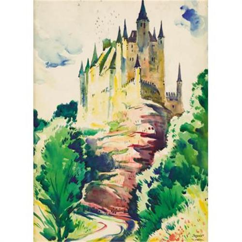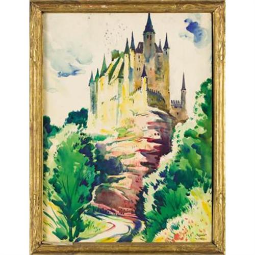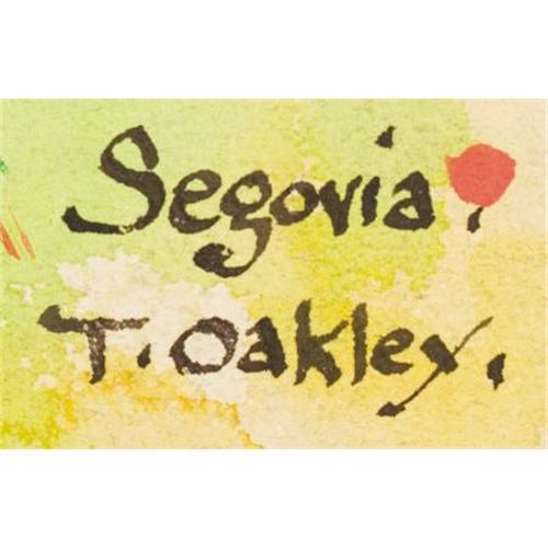 <B>THORNTON OAKLEY (American, 1881-1953)</B></I><BR><I>Segovia, Spain</B></I><BR>Watercolor on cardboard<BR>30 x 22 inches (76.2 x 55.9 cm)<BR>Signed lower right: <I>Segovia/T. Oakley</B></I><BR> <B>Condition Report:</B> Puncture to board at lower left edge, approximately 1 inch x 1 inch; loss to lower left corner; surface dirt.<BR><BR><b>Shipping:</b> Framed - without Glass, Medium (<a target="_blank" href="http://www.heritageauctions.com/common/shipping.php">view shipping information</a>)