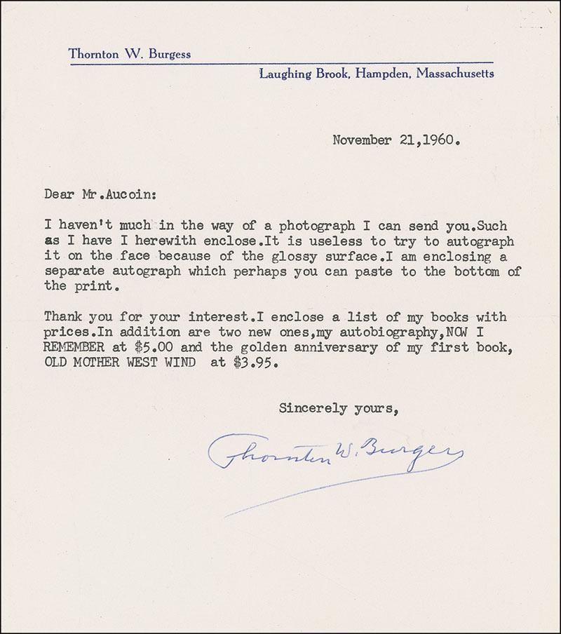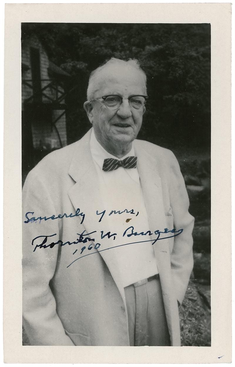 American writer who, drawing on the bedtime stories he told to his son, published fifty-four books of stories for children, many featuring a cast of animals with human names and behavior. Two items: TLS, one page, 6.25 x 7, personal letterhead, dated November 21, 1960. Letter to Lionel Aucoin. In part: “I haven’t much in the way of a photograph I can send you. Such as I have herewith enclose. It is useless to try to autograph it on the face because of the glossy surface.”; and a vintage glossy 3.5 x 5.5 photo of Burgess, signed in black ink, “Sincerely yours, Thornton W. Burgess.” In fine condition. Accompanied by the original mailing envelope. RRAuction COA.
