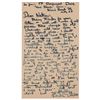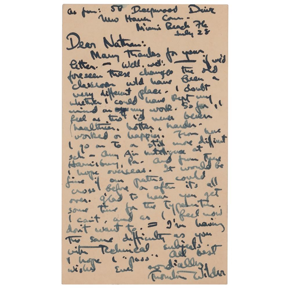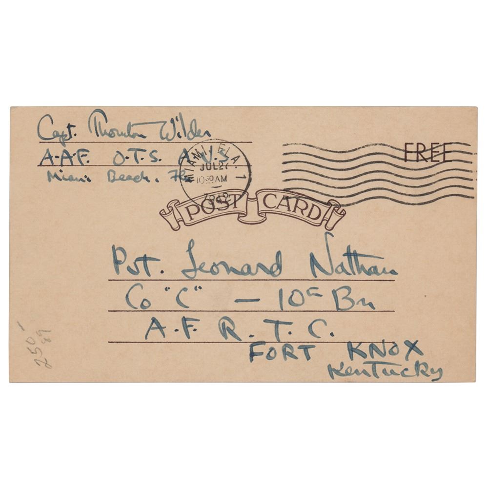 World War II-dated ALS penned on the reverse of a 3.25 x 5.5 government postcard, July 28, 1942. Handwritten letter to Private Leonard Nathan at Fort Knox, Kentucky, in full: "Many thanks for your letter. Well, well!—if we'd foreseen these changes the old classroom would have been a very different place. I doubt whether I could have put my mind on my work. So far I feel as tho' I'd never been healthier, better, harder worked or happier. From here I go to a still more difficult sch—Army Air Intelligence at Harrisburg, Pa., and from there I hope overseas. It would be fine if our paths could cross before or after it's all over. Glad to hear you get some time for the typewriter. I can't, and as I feel now don't want to. = I'm having the same difficulty as you with Technical subjects. I hope I 'pass.' All best wishes." Wilder incorporates his signature into the return address field: "Capt. Thornton Wilder, A.A.F. O.T.S. A U.S., Miami Beach, Fl." In fine condition. A scarce wartime letter penned by Wilder during officer training. During World War II, Wilder rose to the rank of lieutenant colonel in the U.S. Army Air Force Intelligence, first in Africa, then in Italy until 1945. He received several awards for his military service.