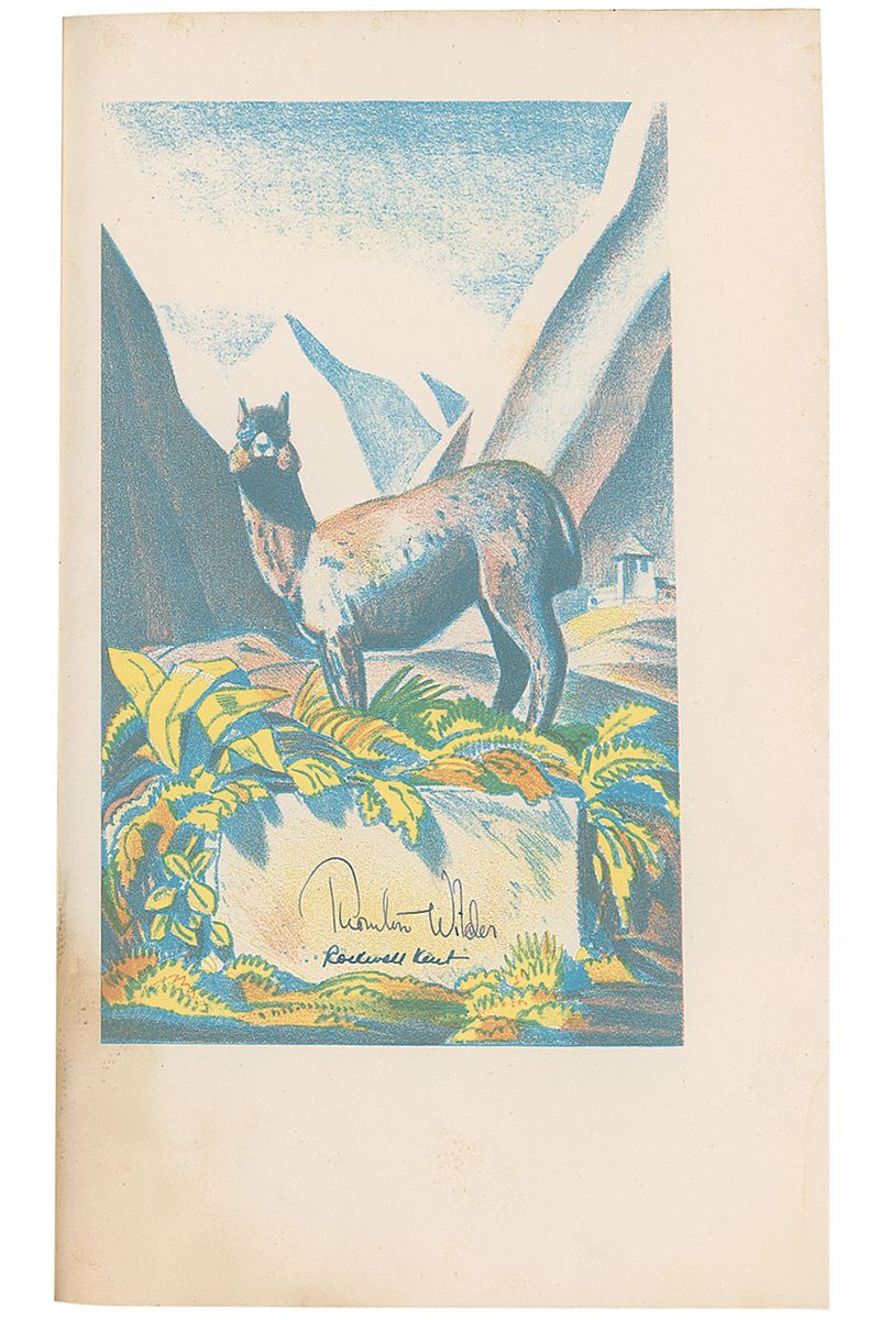 Signed book: The Bridge of San Luis Rey. First edition, limited issue, numbered 244/1100. NY: Albert & Charles Boni, 1929. Hardcover, 7.5 x 10.75, 120 pages. Signed on the colophon in ink by Wilder and Kent. In very good condition, with scattered toning and soiling to covers, and areas of soiling to the lower inner margin of most pages inside.