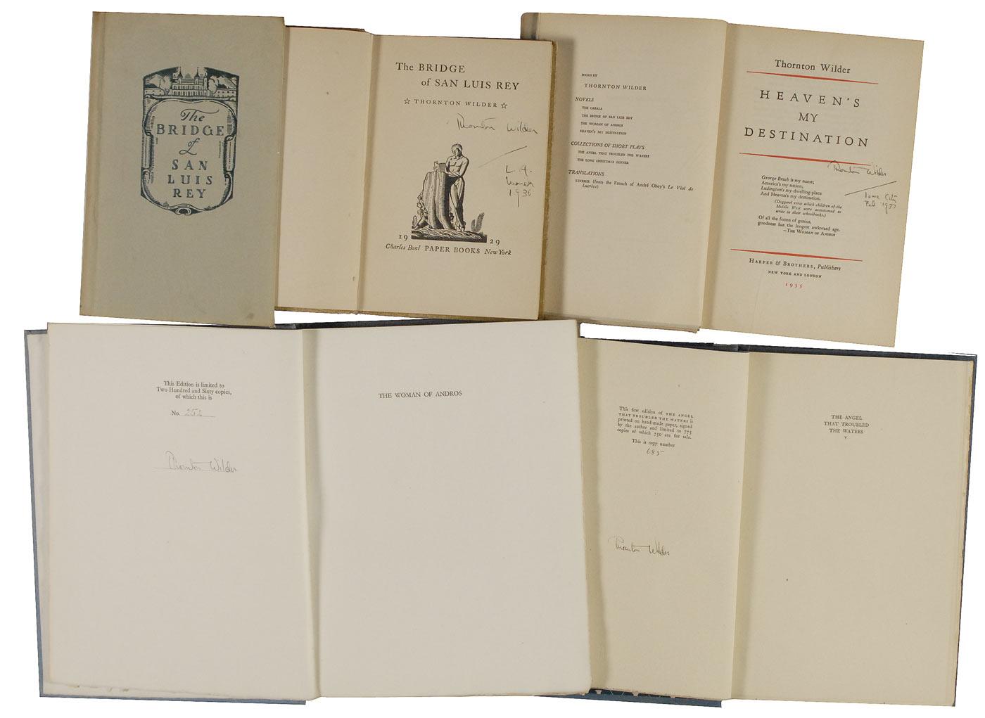 Five hardcover books: two different copies of The Bridge of San Luis Rey, one signed on the title page and dated March 1936, the other signed on the half-title page and dated March 1929; Heaven’s My Destination, signed on the title page and dated February 1937; a limited edition copy of The Woman of Andors, #252/260, signed on the limitations page; and limited edition first edition of The Angel that Troubled the Waters, #685/775, signed on the limitations page. In very good to fine overall condition.