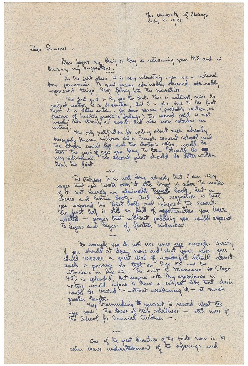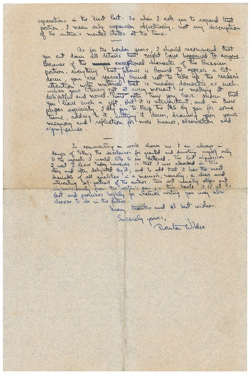 ALS, one page both sides, 6.5 x 10, July 9, 1933. Letter to Princess Alexa Rostislav offering comments and insight on her manuscript which she sent to Wilder. In part: “In the first place it is very interesting; you are a natural born penwoman. A great many admirably observed, admirably expressed things keep falling into the narrative. The first part is by far the best. This is natural since its subject matter is so dramatic. But it is also due to the fact that it is better written; for some reason (probably caution, or fearing hurting people & feelings). The second part is not merely less stirring as event, but also more colorless as writing…The Odyssey is so well done already that I am very eager that you work over it still longer in order to make of it not merely an admirable Topical book, but a choice and lasting book. And my suggestion is that you expand the first half and compress the second. The first half is still so full of opportunities you have wasted—pages that without padding you could expand to layers and layers of further richness!