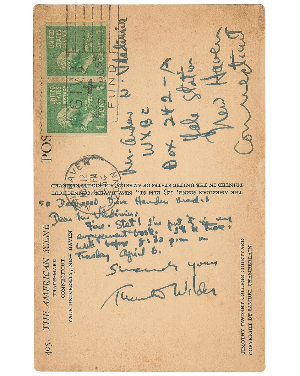 ALS, one page on the reverse of a Yale University postcard, 5.5 x 3.5, postmarked March 12, 1954. Letter to a gentleman. In full: “Fine. Stet! I’ve put it in my engagement-book. I’ll be there, well before 8:30 pm on Tuesday, April 6.” In very good condition, with noticeable creasing to the upper left corner, scattered toning and soiling, and the postmark lightly affecting some of the text.
