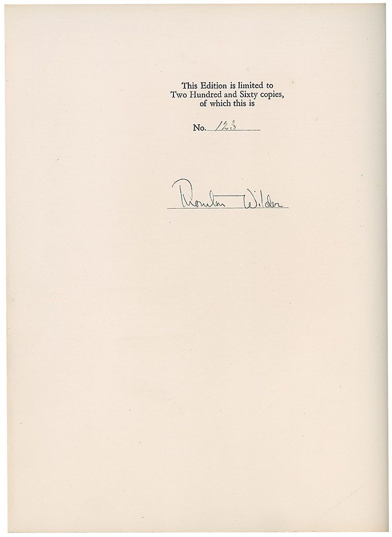 Signed book: The Woman of Andros. First edition, limited issue numbered #123/260. London: Longmans, Green and Co., 1930. Hardcover, 7.75 x 10.5, 105 pages. Signed on the limitations page in black ink. Light toning and rubbing wear, and some rippling to th
