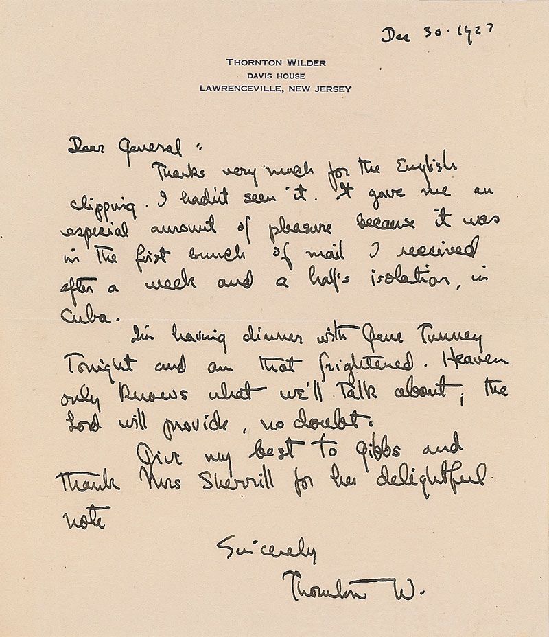 ALS signed “Thornton W,” one page, 6 x 7, personal letterhead, December 30, 1927. Letter to the “General.” In part: “I’m having dinner with Gene Tunney tonight and am that frightened. Heaven knows what we’ll talk about; the Lord will provide, no doubt.” In fine condition.