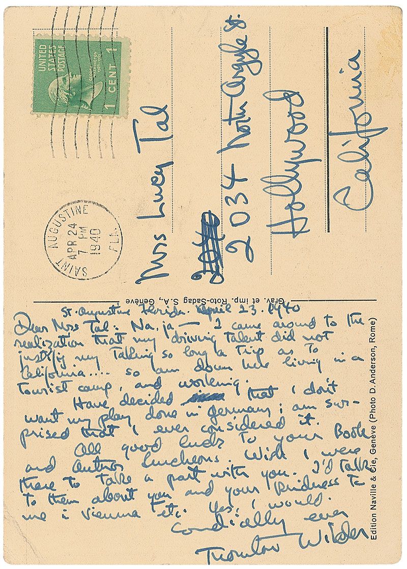 Pulitzer Prize–winning American novelist and dramatist (1897–1975) whose works include such classics as The Bridge of San Luis Rey and Our Town. ALS, one page on the reverse of a 4 x 5.75, April 23, 1940. Letter to Lucy Tal. In part: “Have decided that I don’t want my play done in Germany; am surprised that I even considered it. All good luck to your book and author luncheons. Wish I were there to take a part with you.” A few light creases and impressions, and some trivial soiling, otherwise fine condition.