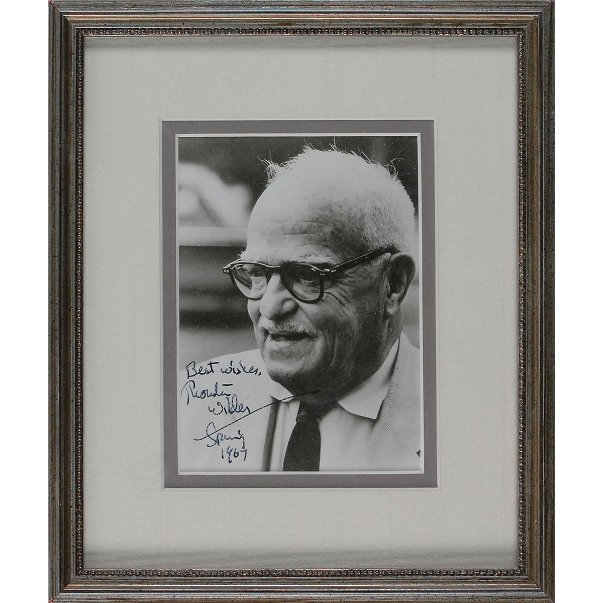 Pulitzer Prize–winning American novelist and dramatist (1897–1975) whose works include such classics as The Bridge of San Luis Rey and Our Town. Glossy 3.5 x 5 photo portrait of Wilder in old age, signed in black ink, “Best wishes, Thornton Wilder, Spring 1967.” Nicely double-matted and framed to an overall size of 7.25 x 8.75. In fine condition.