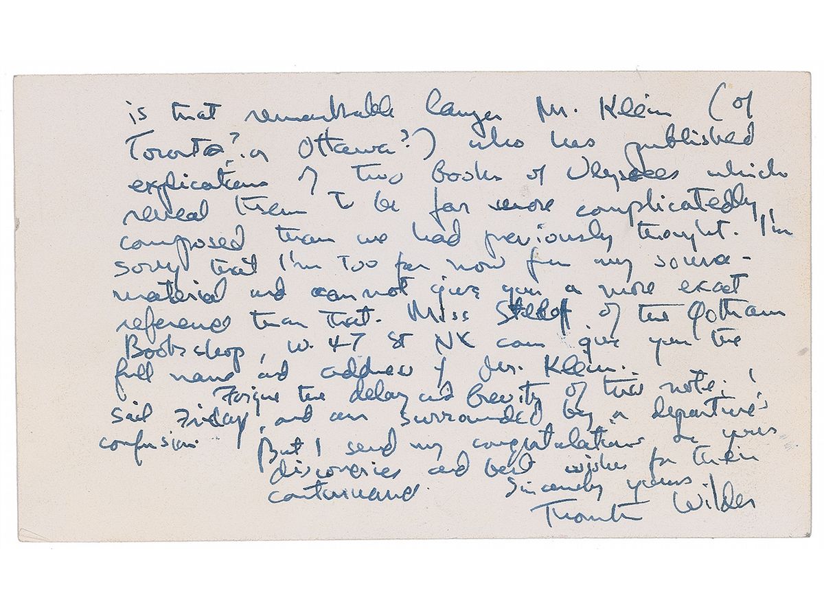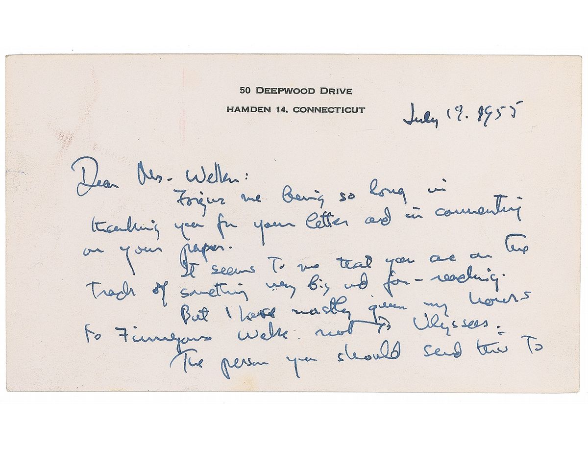 ALS, one page both sides, 6 x 3.5, personal letterhead, July 19, 1955. Letter reads, in part: “It seems to me that you are on the track of something very big and far-reaching. But I have mostly given my hours to Finnegan’s Wake, not to Ulysses. The person you should send this to is that remarkable lawyer Mr. Klein…who has published explications of two books of Ulysses which reveal them to be far more complicatedly composed than we had previously thought.” In fine condition.