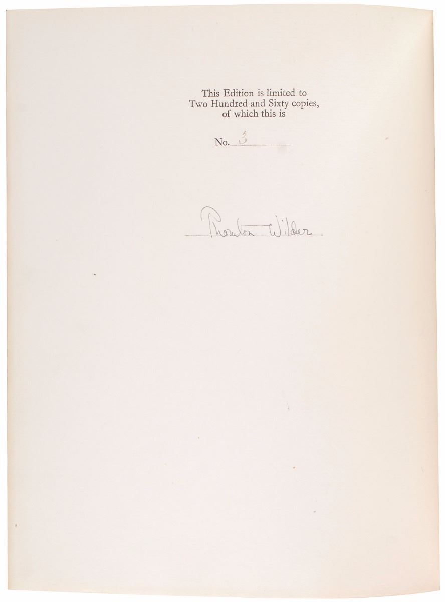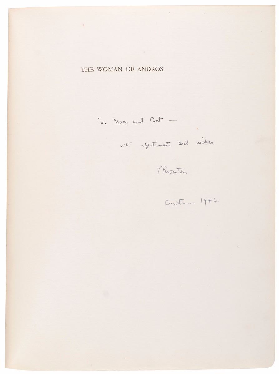 Signed book: The Woman of Andros. First edition, limited issue, numbered 3/260. NY: Longmans, Green and Co., 1930. Hardcover, 8 x 10.25, 105 pages. Signed on the colophon in black ink, “Thornton Wilder,” and signed and inscribed on the half-title page in black ink, “For Mary and Curt—with affectionate best wishes, Thornton, Christmas 1946.” In fine condition, with trivial toning and soiling to signed pages, and mild sunning to spine.