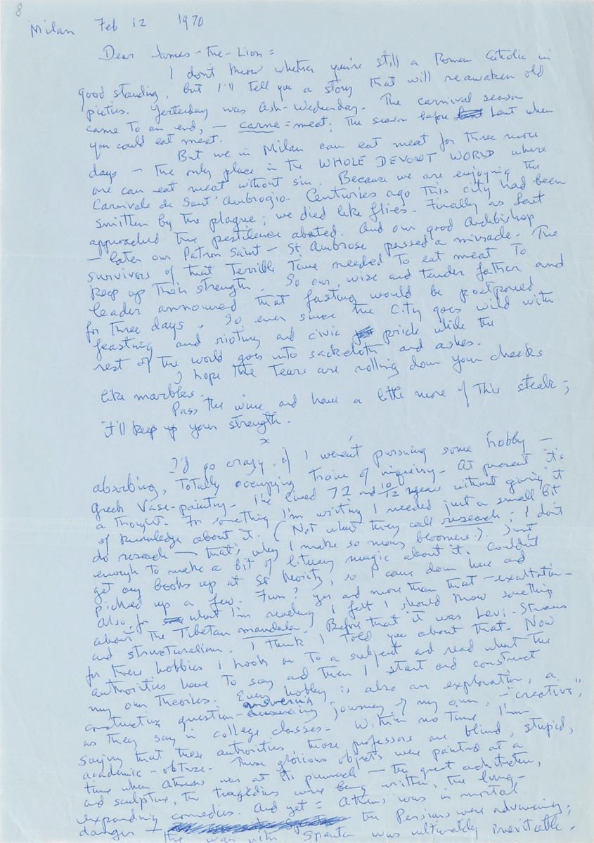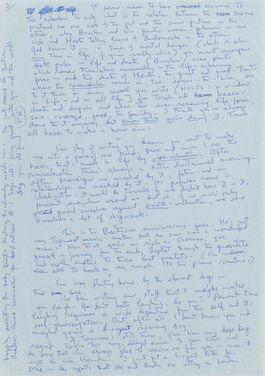 ALS signed “T. N.,” two pages, 5.75 x 8.25, February 12, 1970. Lengthy letter to noted author James “the lion” Herlihy, in part: “I’d go crazy if I weren’t pursuing some hobby—absorbing, totally occupying train of inquiry—at present it’s Greek vase-painting. I’ve lived 72 and 10/12 years without giving it a thought. For something I’m writing I needed just a small bit of knowledge about it (Not what they call research; I don’t do research—…Also for what I’m reading I felt I should know something about the Tibetan mandala. Before that it was Levi–Strauss and structuralism…Every hobby is also an exploration, a constructing question—answering journey of my own—’creative’ as they say in college classes. Within no time I’m saying that these authorities, those professors are blind, stupid, academic—obtuse…I’m shy of writing you because you want to make me into a guru of some kind. More and more I see the havoc that’s made in life by overvaluation. After overvaluation there’s always a bitter disillusioned morning after. Marriages are wrecked by it. Its popular name is idealization. It would be terrible if we didn’t have it…If Tennessee’s still there, give him my deep deep regard…I just got a buoyant letter from Mia—she reports that she and Andre are sitting in London happily awaiting the baby that’s kicking boisterously inside her.” In fine condition. Accompanied by the original mailing envelope, addressed in his own hand.