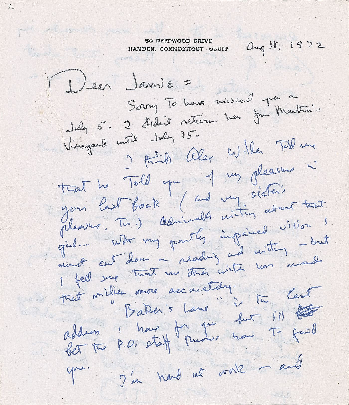 ALS signed “T. N.,” one page both sides, 6 x 7, August 18, 1972. Letter to author James Herlihy, in part: "Sorry to have missed you on July 5. I didn't return here from Martha's Vineyard until July 15. I think Alec Wilder told me he told you of my pleasure in your last book (and my sister's pleasure, too.) Admirable writing about that girl…with my partly impaired vision I…cut down on reading and writing—but I feel sure that no other writer has made that milieu more accurately. 'Baker's Lane' is the last address I have for you but I'll bet the P. O. staff knows how to find you. I'm hard at work—and engrossed in it. You may remember my (and G. Stein's) theory that what one writes should come to me as a surprise. I'm very old now, but I don't feel that way. Remember to write every day—it's no guarantee of inspiration, but inspiration likes to be invoked. I hope you've outgrown smoking four-leafed-clovers and other roadside plants. I've just been reading how Nietzsche smoked no tobacco, and drank no coffee." In very good to fine condition, with moderate overall creasing.
