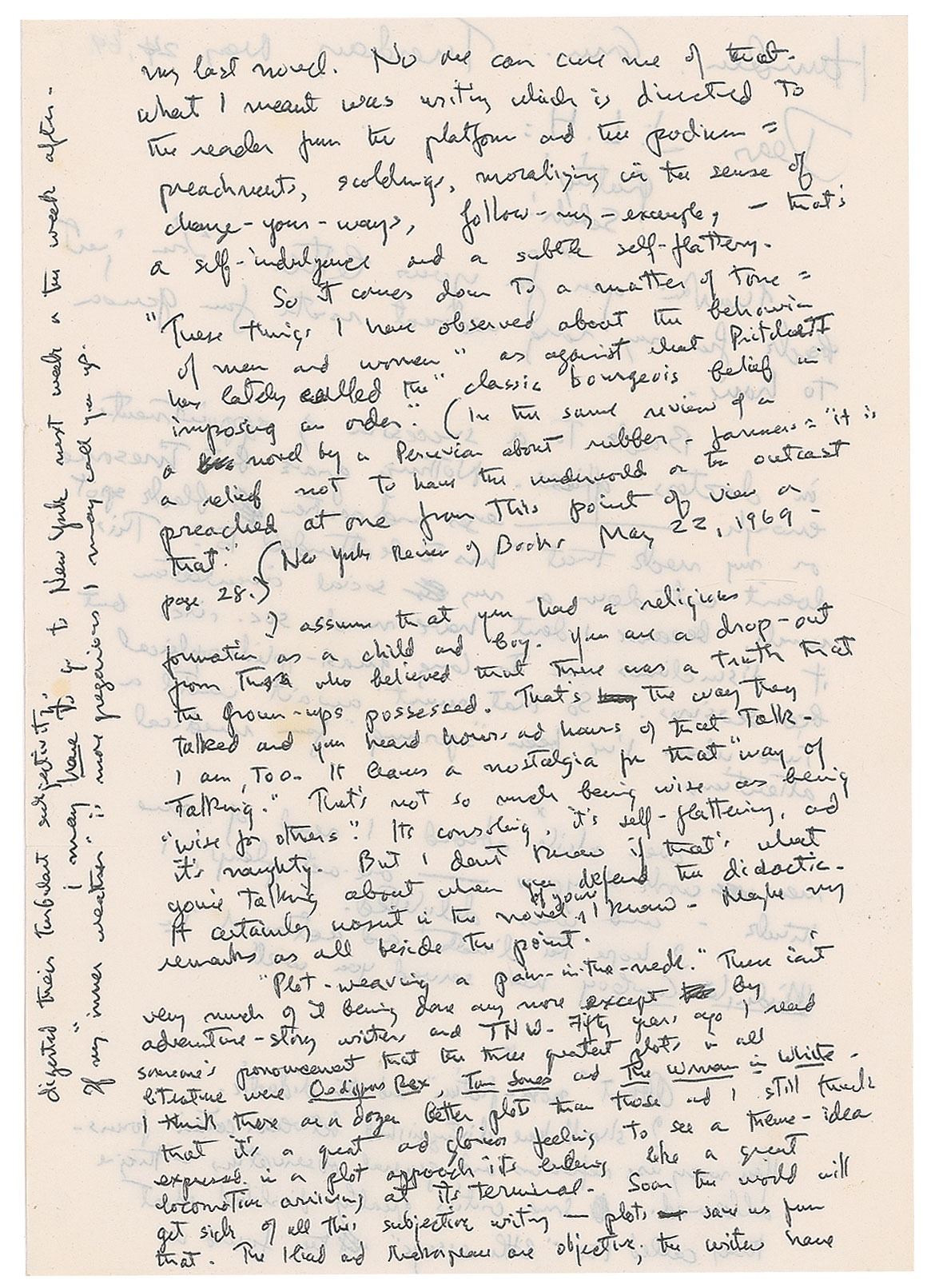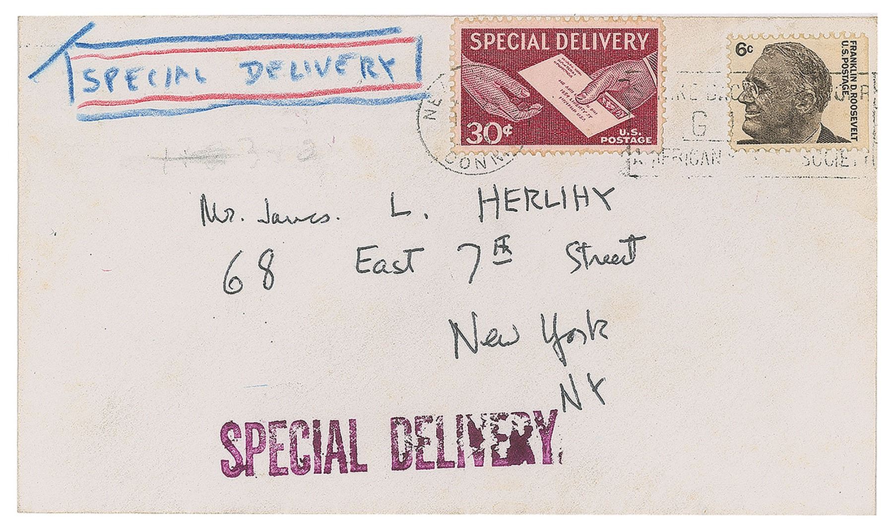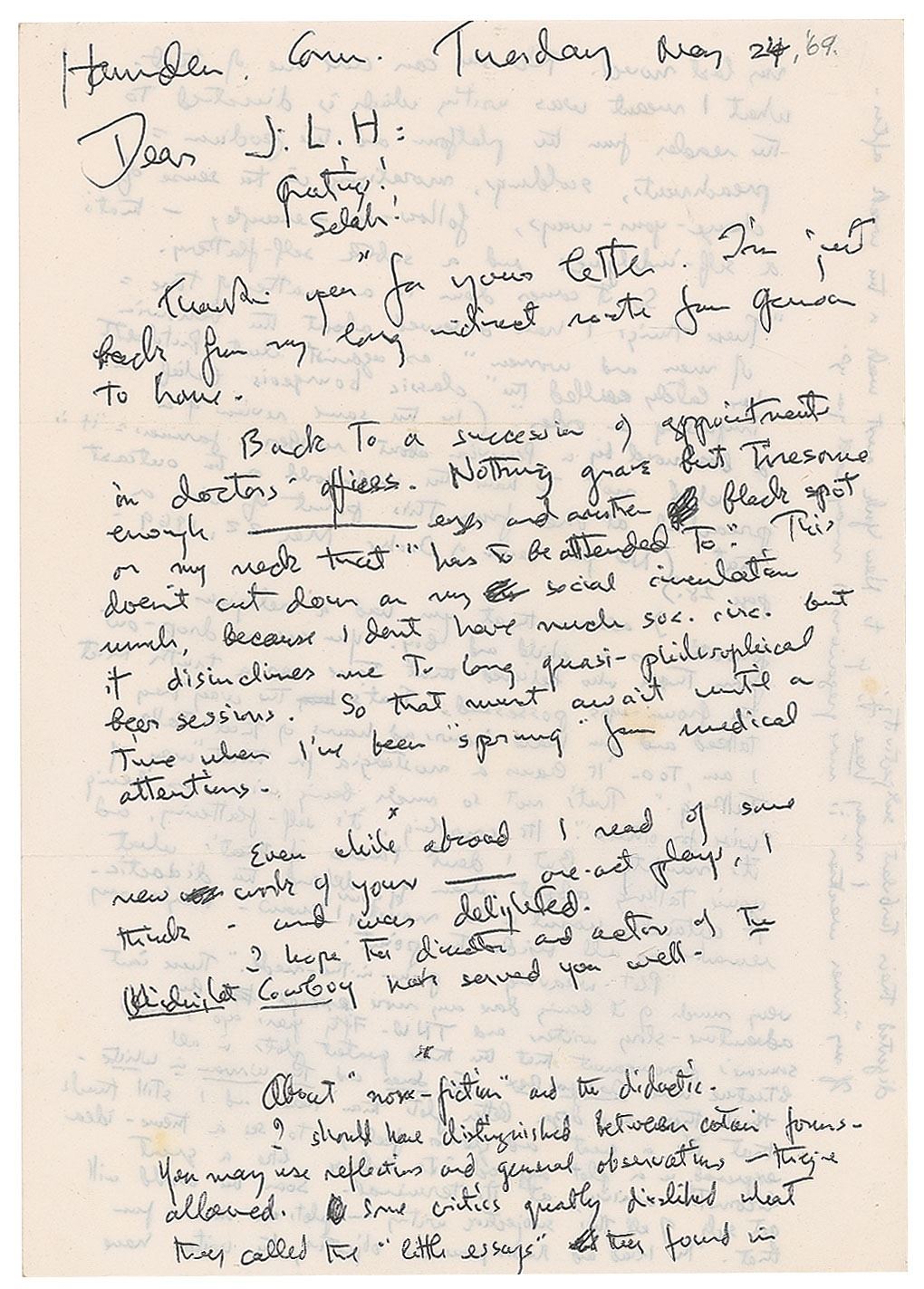 ALS signed on the reverse of the accompanying mailing envelope, “T. N. Wilder,” one page both sides, May 24, 1969. Fascinating letter to noted novelist and playwright James Leo Herlihy, in part: "I'm just back from my long indirect route from Genoa to home. Back to a succession of appointments in doctors' offices. Nothing rave but tiresome enough—eyes and another black spot on my neck that 'has to be attended to.' This doesn't cut down on my social circulation much, because I don't have much soc. circ. but it disinclines me to long quasi-philosophical beer sessions. So that must await until a time when I've been 'sprung' from medical attentions. Even while abroad I read of some new work of yours—one-act plays, I think—and was delighted. I hope the director and actor of The Midnight Cowboy have served you well." In fine condition.