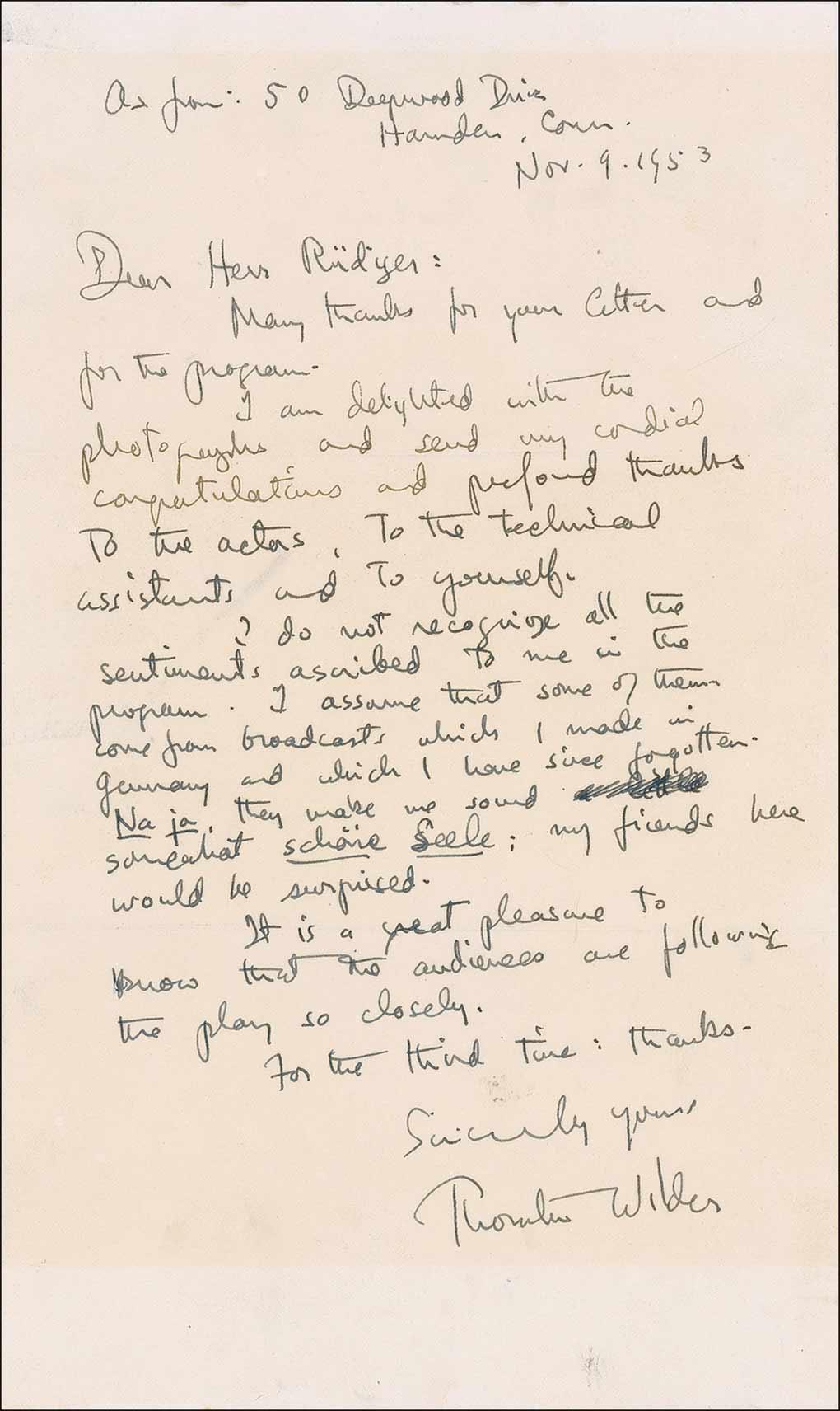 Pulitzer Prize–winning American novelist and dramatist (1897–1975) whose works include such classics as The Bridge of San Luis Rey and Our Town. ALS, one page, 6.25 x 10.25, November 9, 1953. Letter to Reinhold Rüdiger, the theater manager of the Hannover state theater. In full: “Many thanks for your letter and for the program. I am delighted with the photographs and send my cordial congratulations and profound thanks to the actors, to the technical assistants and to yourself. I do not recognize all the sentiments ascribed to me in the program. I assume that some of them come from broadcasts which I made in Germany and which I have since forgotten. ‘Na ja’, they make me sound somewhat ‘schöne Seele’; my friends here would be surprised. It is a great pleasure to know that the audiences are following the play so closely.” Accompanied by the original mailing envelope. In fine condition, with a mild overall shade of toning.