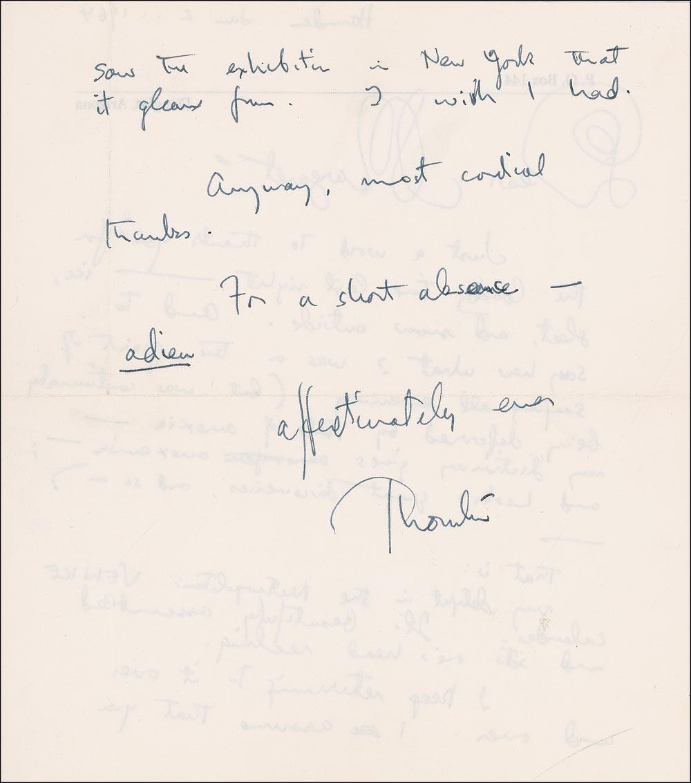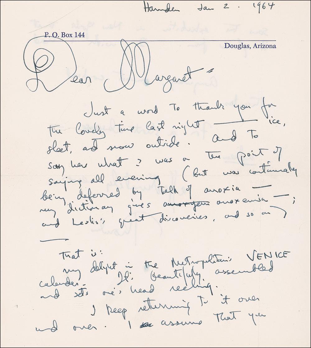 Pulitzer Prize–winning American novelist and dramatist (1897–1975) whose works include such classics as The Bridge of San Luis Rey and Our Town. ALS signed “Thornton,” one page both sides, 6.25 x 7, personal letterhead, January 2, 1964. Letter written to Margaret after an evening spent together. In part, “Just a word to say thank you for the lovely time last night-ice, sleet, and snow outside. And to say here what ? was a true point of saying all evening (but was continually deferred by talk of anoxia-my dictionary gives anoxemia-and Leslie’s great discoveries, and so on. That is: My delight in the Metropolitan; Venice calendar. It is beautifully assembled and sets one’s head reeling. I keep returning to it over and over. I assume that you saw the exhibition in New York that it gleans from.” A couple slight brushes to text, intersecting mailing folds, and a few creases, otherwise fine condition.
