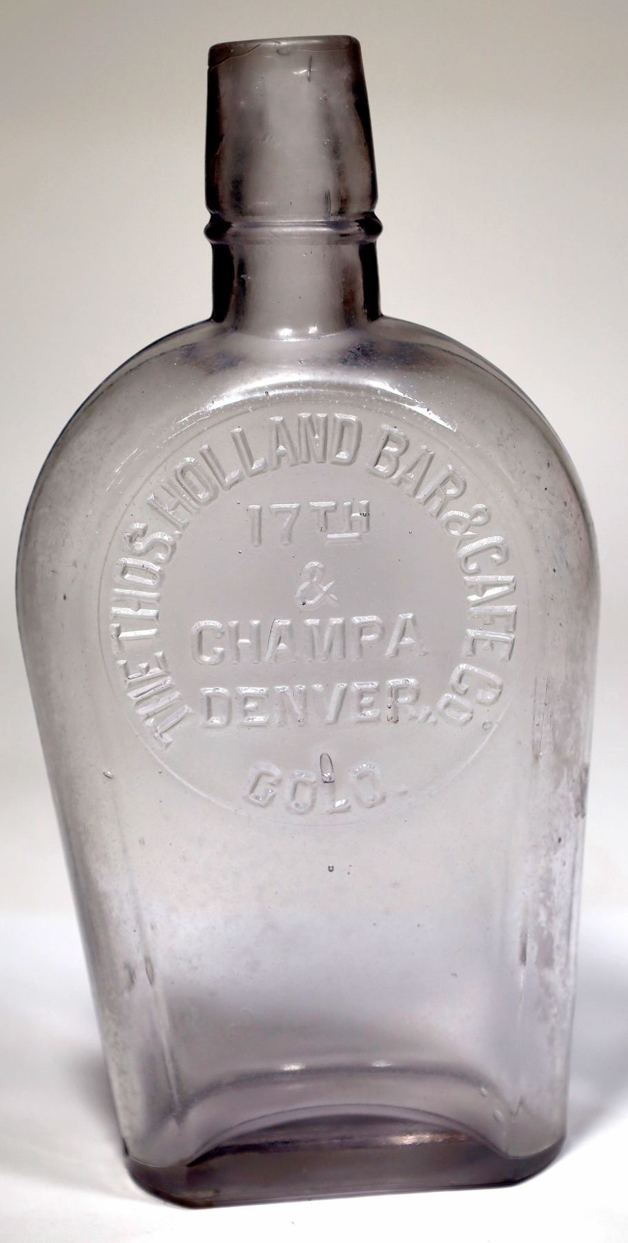 Preble W-54a. The Thos. Holland Bar & Cafe Co. / 17th / & / Champa / Denver, / Colo. Clear pint flask, 7 5/8", wiped top. Damaged on front right side in two places. Also haziness. Please inspect.