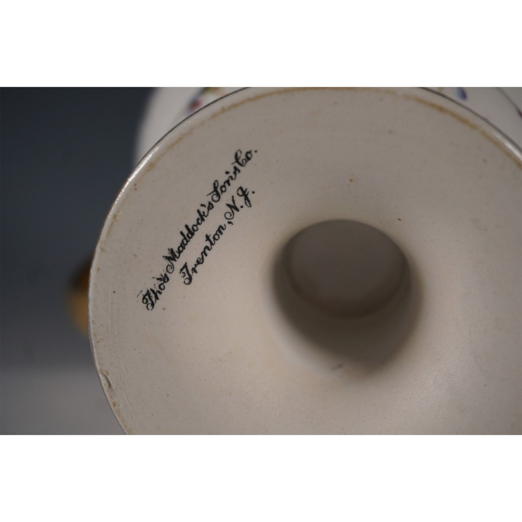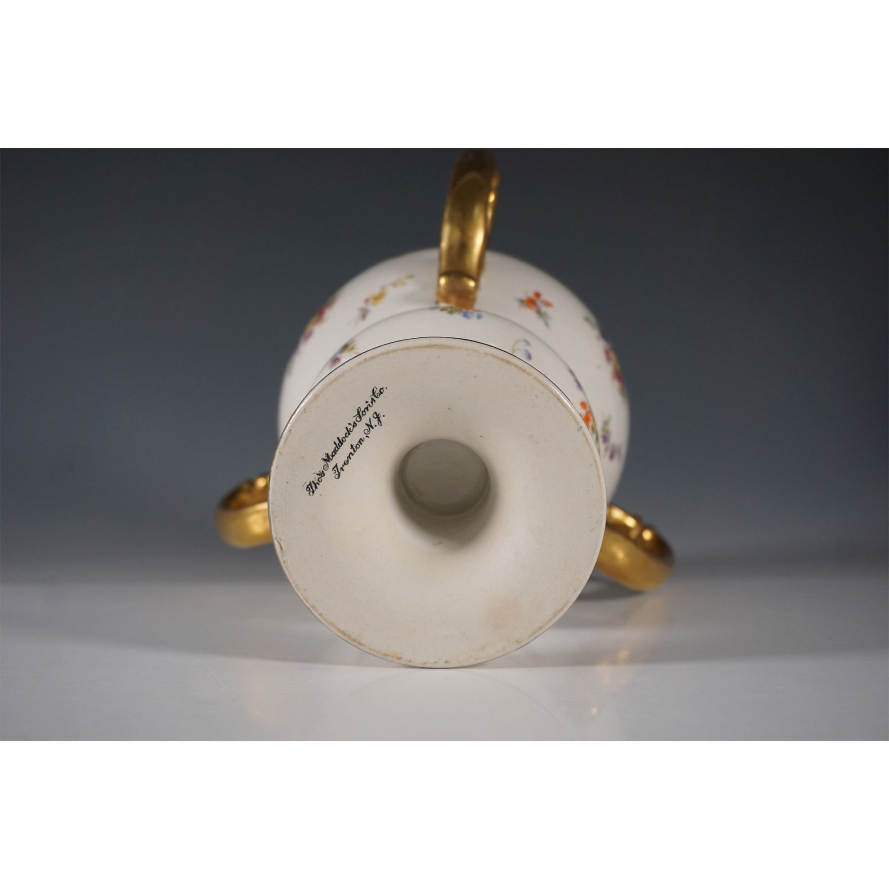 This exquisite porcelain vase by Thos. Maddock & Sons features a delicate hand-painted floral design, with a variety of colorful blooms scattered across the surface. The vase is adorned with elegant gold handles, complementing its elegant shape and floral motif. The underside of the vase is marked with the Thos. Maddock's Sons Co. backstamp from Trenton, New Jersey, indicating its origin. A stunning piece of American porcelain craftsmanship.