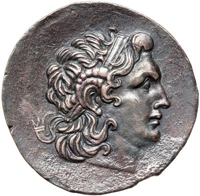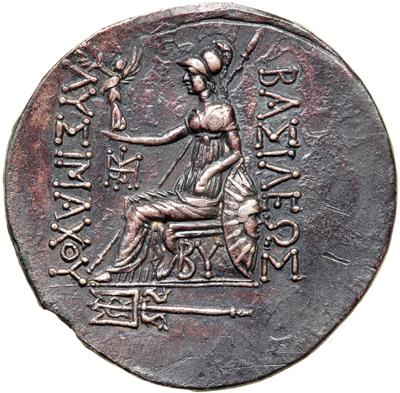 Thracian Kingdom. Lysimachos, 323-281 BC. AR Tetradrachm (16.79 g), Byzantion mint, struck posthumously c. 195 BC. Diademed head right of Alexander the Great, wearing horn of Ammon. Reverse: Athena enthroned left; trident in exergue, "BY" below throne. Cf. Seyrig (Essays Robinson), pl. 23, 12; SNG Cop 1141 var (monogram not listed). Porosity, especially at lower quadrant of obverse; artificially toned, on a very large flan. About Extremely Fine.