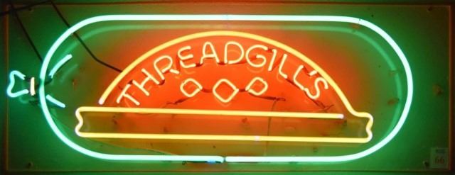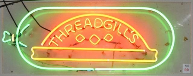 Neon "Threadgill's chub" sign that was custom made in the 1980s for Threadgill's frozen vegetables. 16" x 32"