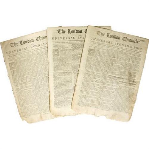 <B>Three 1757 Issues of <I>The London Chronicle.</B></I></B></I> Each issue measures 8.25” x 11.25”, contains 8 pages, includes issue numbers 103, 105, and 118, toned and tatty about the edges, disbound from a larger volume, else complete and legible. All the news fit to print circa 1757 including shipping news, advertisements, etc. <I>Ex. Henry E. Luhrs Collection.</B></I> <BR><BR><b>Shipping:</b> Flat Material, Small (<a target="_blank" href="http://www.heritageauctions.com/common/shipping.php">view shipping information</a>)