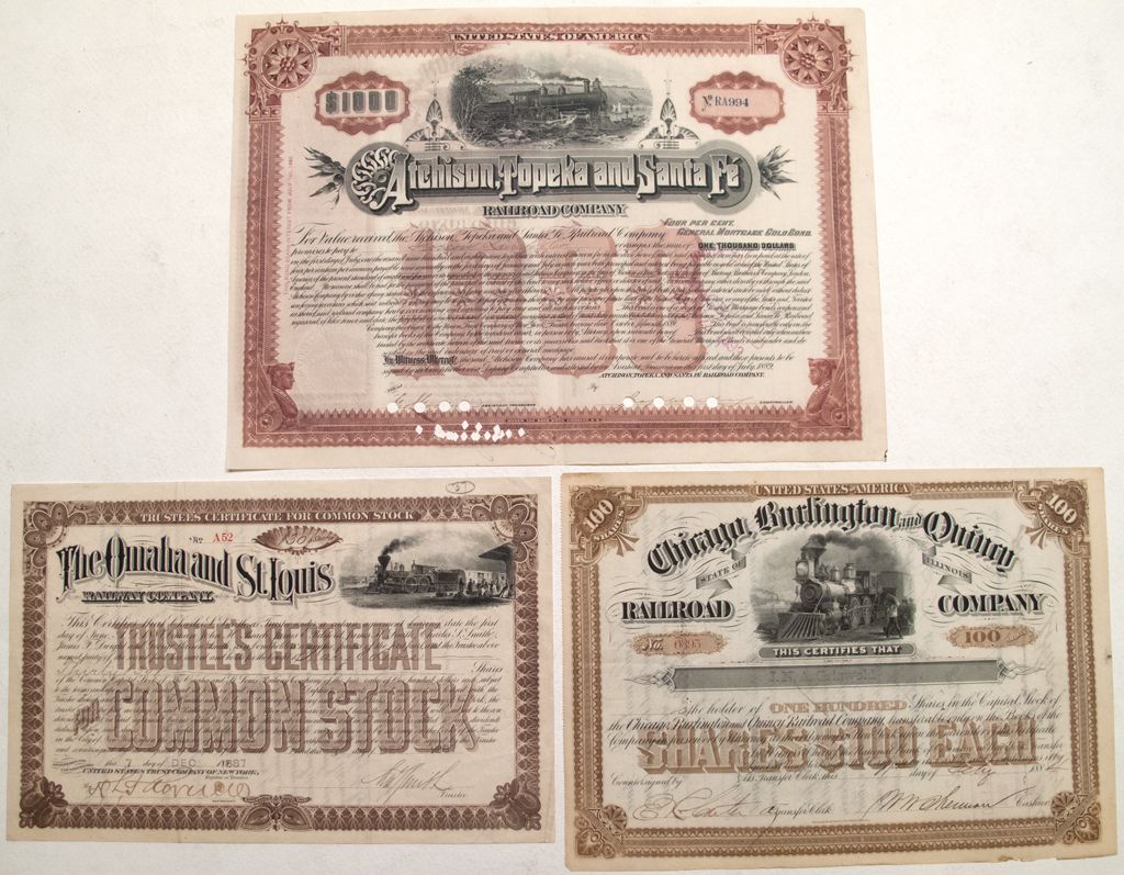 1) Chicago, Burlington and Quincy. #395 for 100 shares at $100 each to J. N. A. Griswold in 1884, Signed by M Sherman and ?. 2) The Omaha and St. Louis. #A52 for 30 shares to Mary Lewis in 1887. Common Stock. 3) General Mortgage Bond for the Atchison, Topeka and Santa Fe. #RA994 for $1000. Cancelled. ASLL 3 have vignettes of steam locomotives.