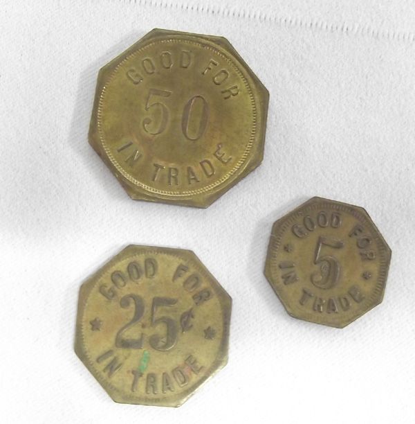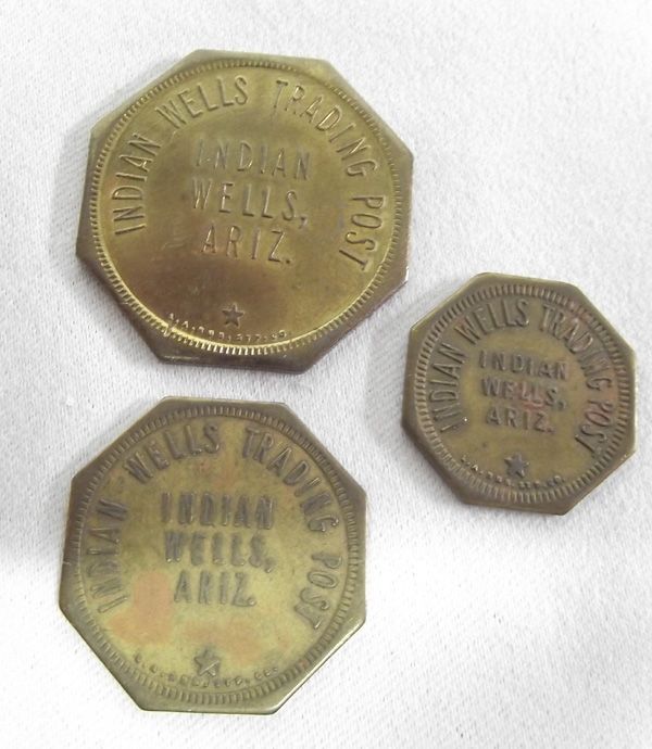 Three 1900 Indian Wells Trading Post on the Navajo Indian Reservation, at Indian Wells, Arizona. Tokens include 50 cent, 25 cent & 10 cent tokens.