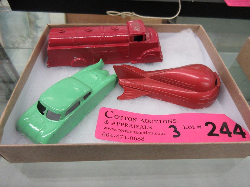 New old stock. 4" fire department water tanker truck, 3" Buck Rogers archive spaceship, 3.5" futuristic streamline rocket ship