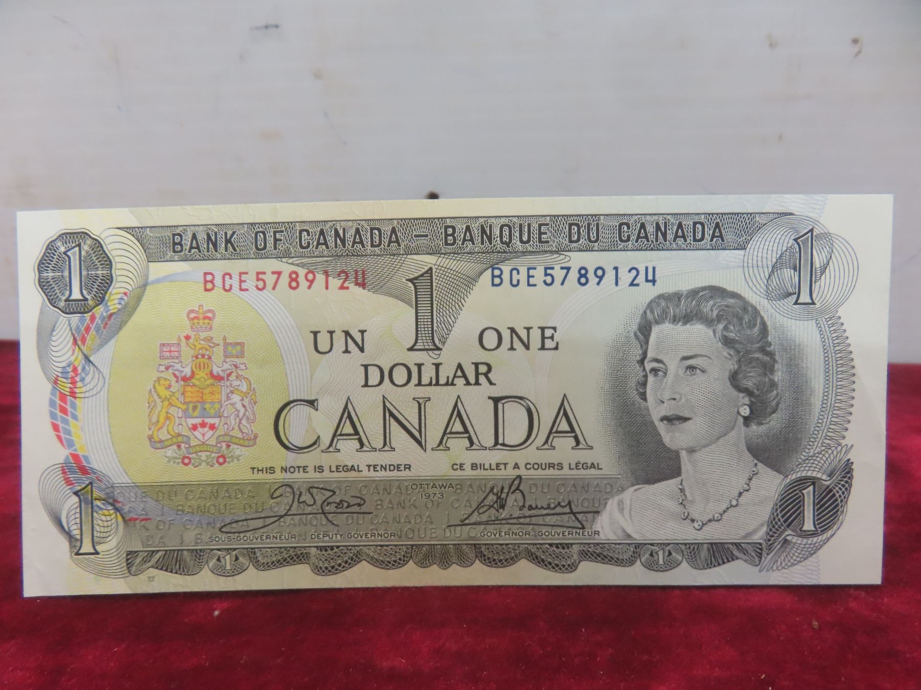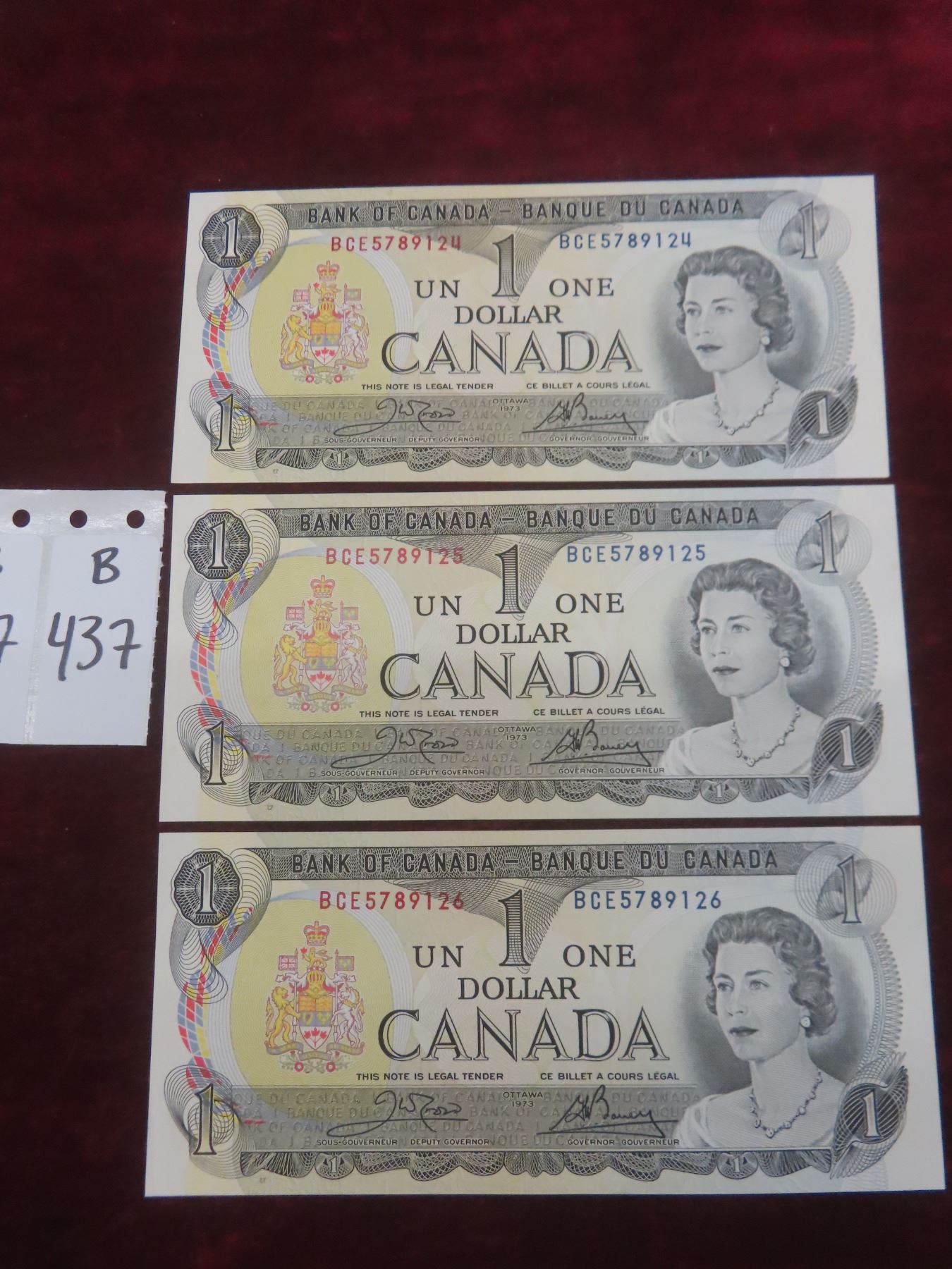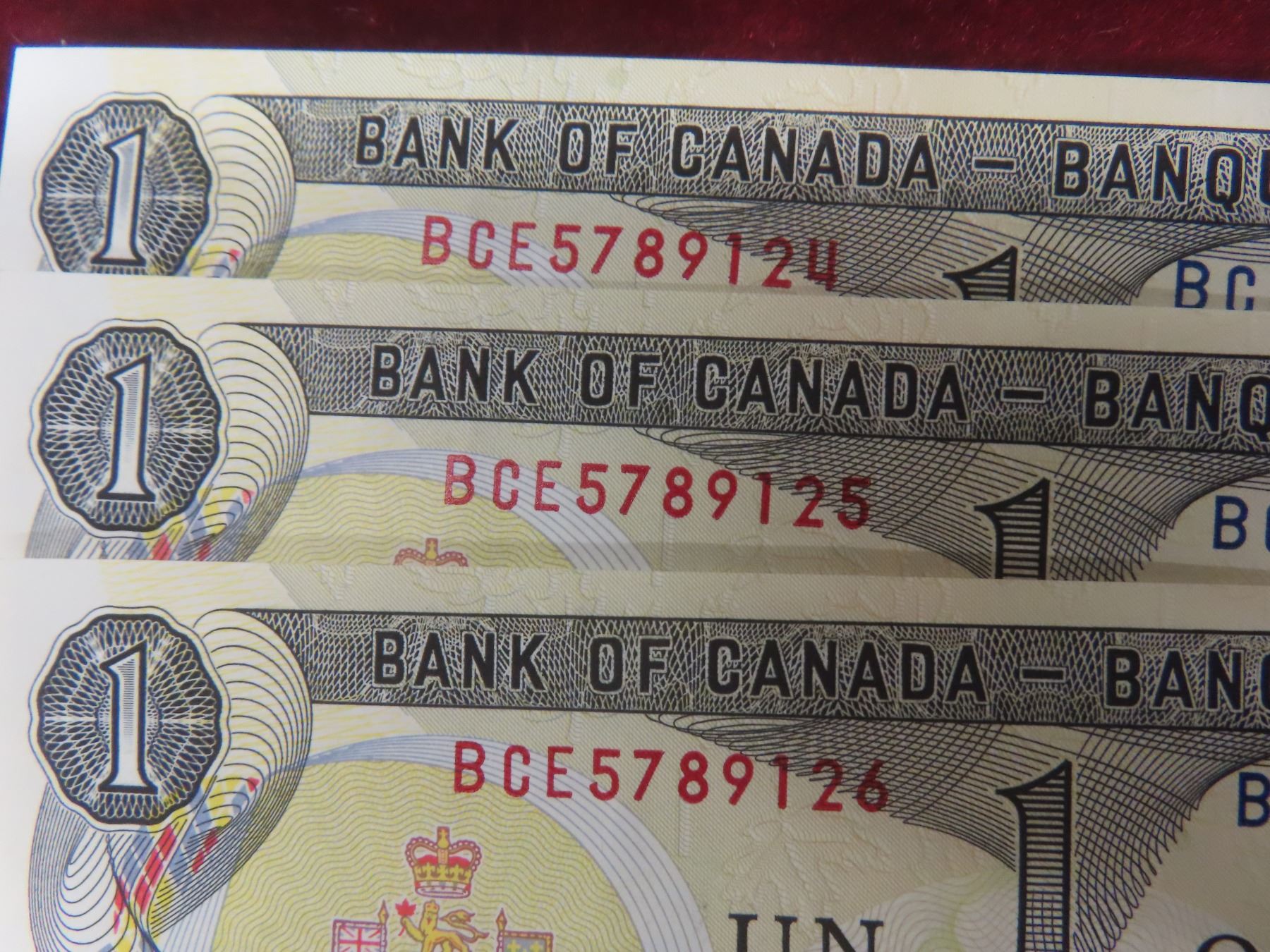 Three 1973 Canadian $1 Bills with Consecutive Serial Numbers