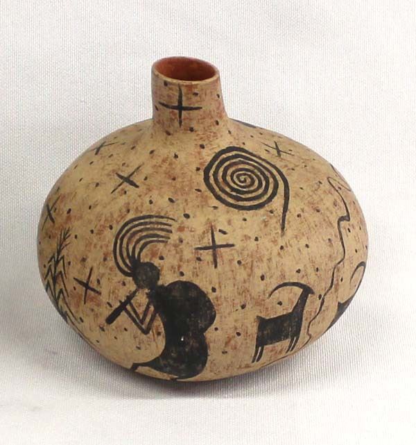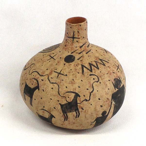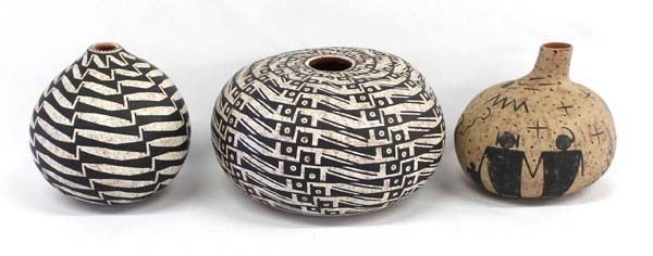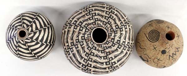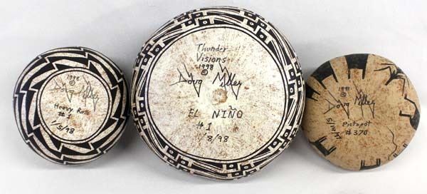 Three 1998 Thunder Visions Hand Painted Gourds by Doug Miller, includes 1. El Nino #1, measures 5.25''D x 3''H, dated 1/8/98 and is signed on the bottom 2. Heavy Rath #1, measures 3.5''D x 3.75''H, dated 1/5/98 and is signed on the bottom 3. Pictopot #370, measures 3.75''D x 3.5''H, dated 5/14/97 and is signed on the bottom, FYI: ''Doug Miller has called Farmington, NM home since 1970. Born in England, he is considered an accomplished, self-taught artist that works in a variety of mediums including gourd art, rock art, acrylic painting and microlithic architectural sculptures.''