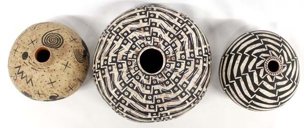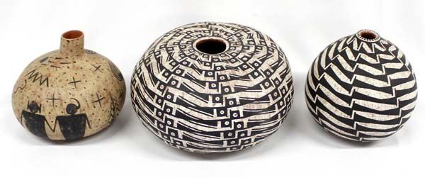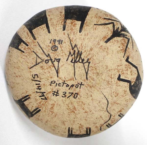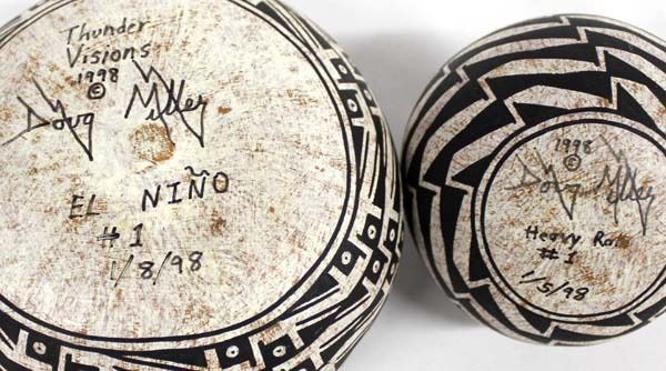 Three 1998 Thunder Visions Hand Painted Gourds by Doug Miller, includes 1. El Nino #1, measures 5.25''D x 3''H, dated 1/8/98 and is signed on the bottom 2. Heavy Rath #1, measures 3.5''D x 3.75''H, dated 1/5/98 and is signed on the bottom 3. Pictopot #370, measures 3.75''D x 3.5''H, dated 5/14/97 and is signed on the bottom, FYI: ''Doug Miller has called Farmington, NM home since 1970. Born in England, he is considered an accomplished, self-taught artist that works in a variety of mediums including gourd art, rock art, acrylic painting and microlithic architectural sculptures.''