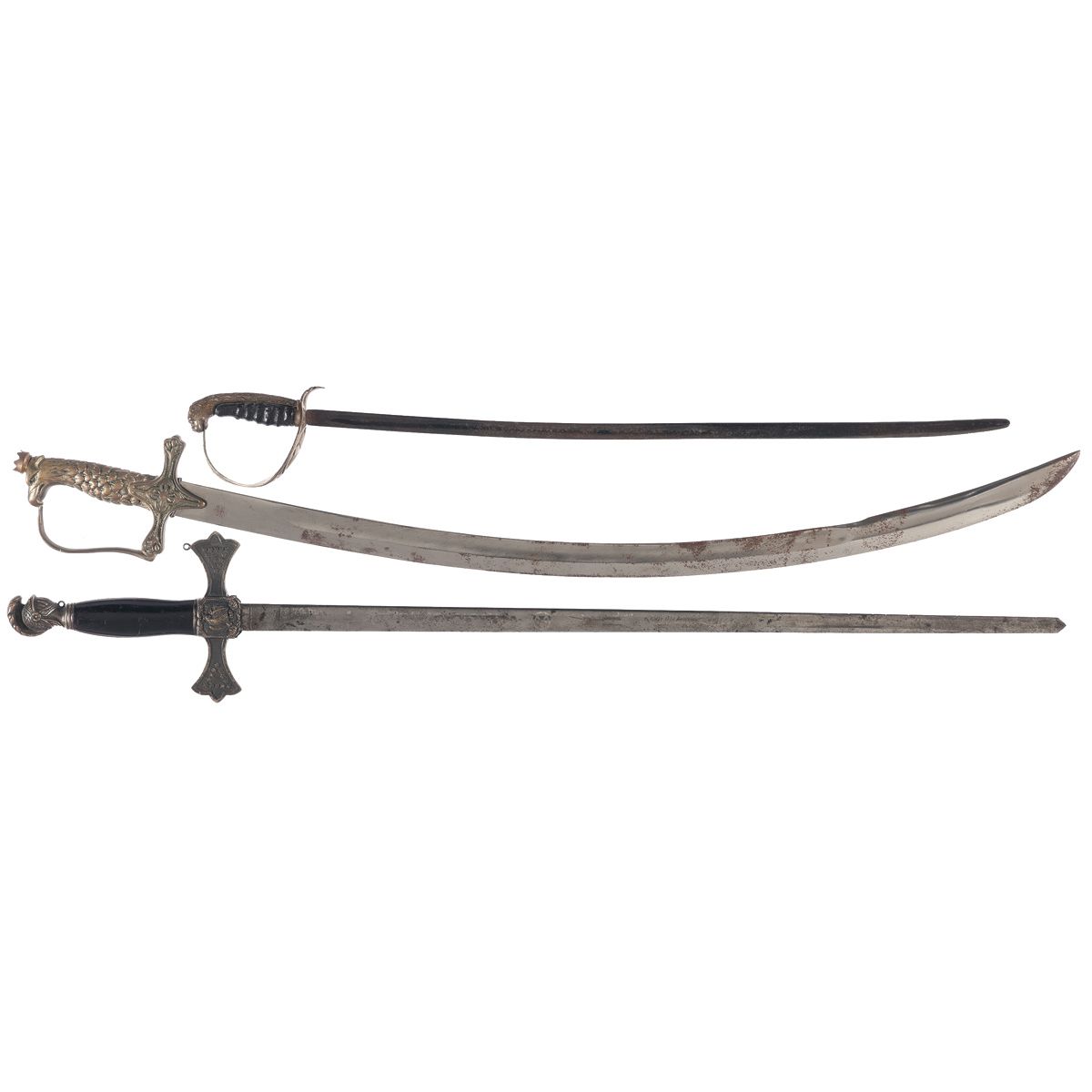 1) Boy's sword, 23" blunt blade, with a brass dog head pommel and ribbed grip. 2) Saber, 29 1/2" blade with etching on one side, and a brass hilt with crowned eagle pommel. 3) Ames lodge sword, 27 1/2" etched blade with "Hector Mackensie" on one side, chain guard and grip inlay absent, with brass guard and helmet pommel. All fine or better.