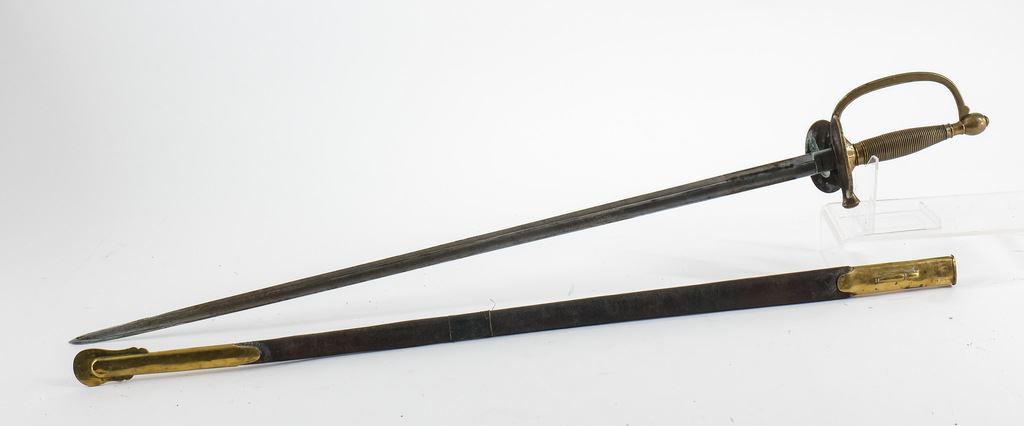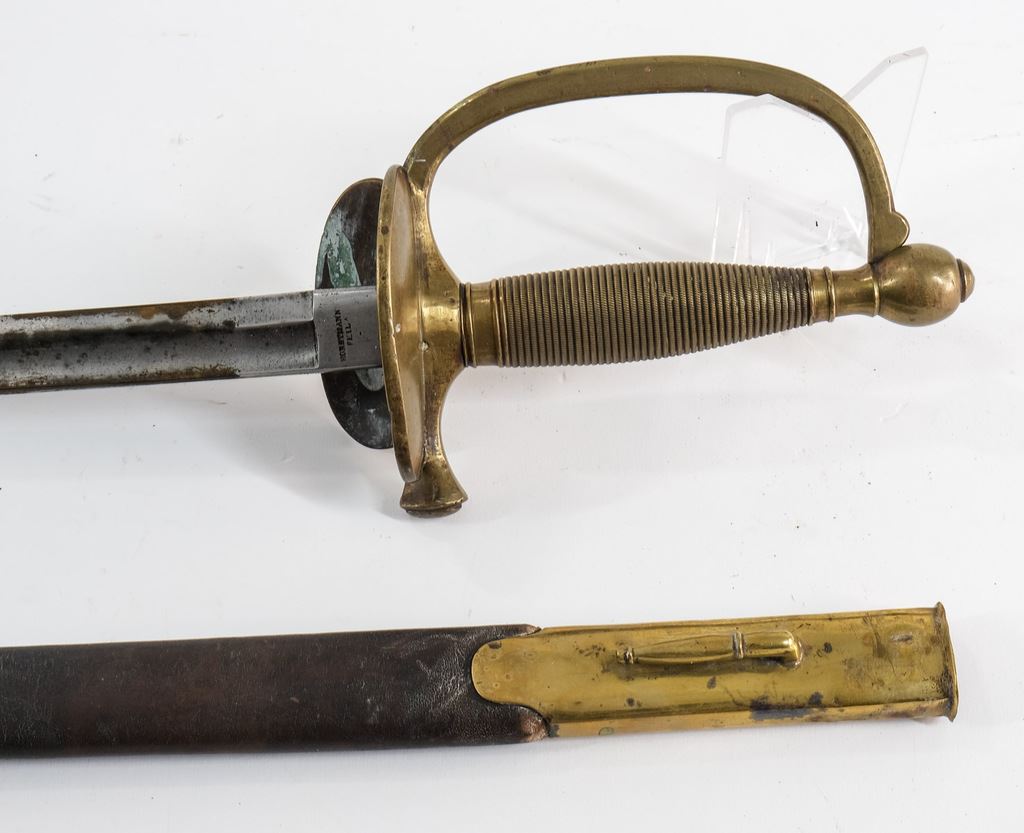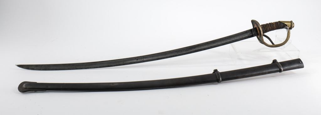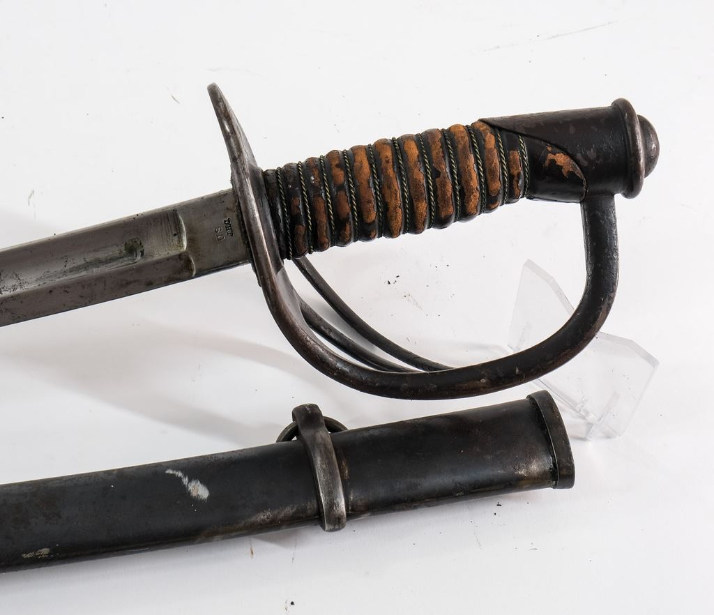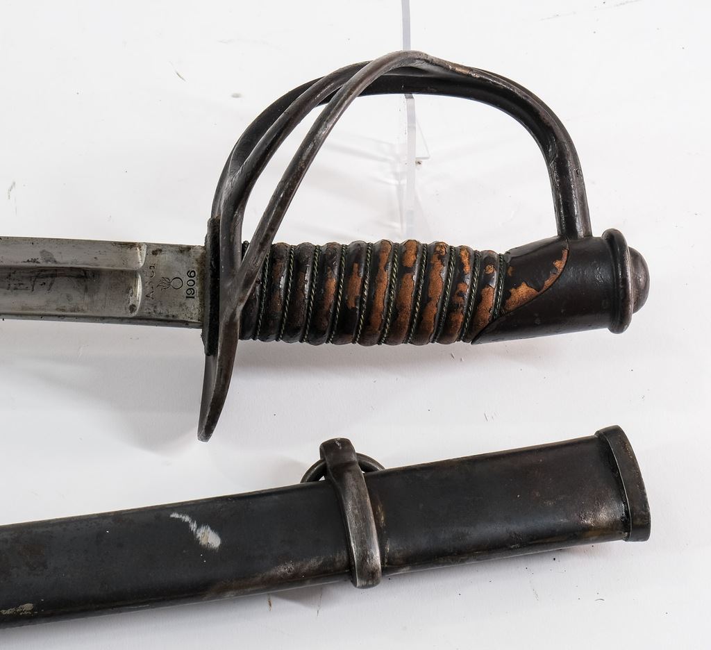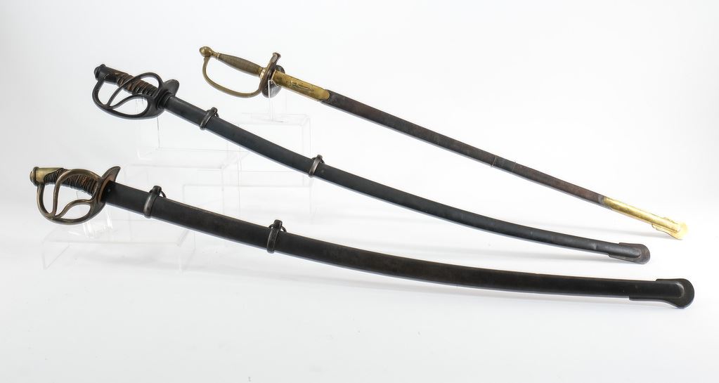 Includes a Model 1840 Cavalry Sword with Solingen Blade, 42" OAL, Steel Scabbard, areas of rust in spots, loose hilt wrap, overall Good+. Also an 1860 Model Cavalry Saber Dated 1906, Made by A. S. Co. Marked U.S. and Inspected J.H.C. Very solid condition with areas of dried preservative, slight wear to leather on hilt, overall Very good. Lastly an M1840 NCO Sword with blade marked Horstmann PHILA, and Collins Hartford Conn. Some areas of rust o blade, with leather scabbard (old repair). 40" OAL. Overall Good+.