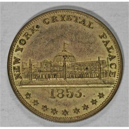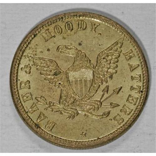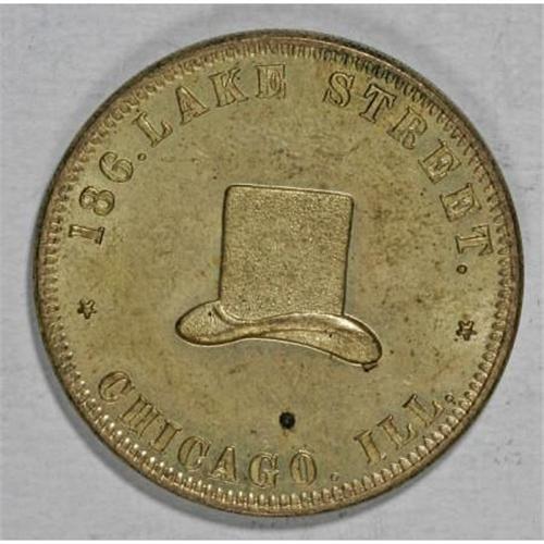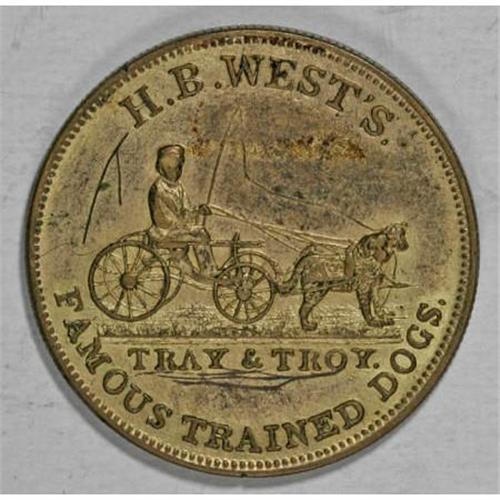 <B>Three 19th Century Store Cards.</B></I> Included are: <B>Baker & Moody,</B></I> Chicago, IL, Miller-Ill-7, brass, reeded edge, AU with a small spot below the hat; <B>H.B. West's Trained Dogs, </B></I>New York, NY, Miller-NY-949, brass, reeded edge, AU sharpness but the obverse is scratched; and a <B>B. Davidson & Co., </B></I>Sioux City, IA, Rulau-Ia-SC-25, gilt brass, holed as issued, Choice AU apart from a spot near 11 o'clock.<BR><BR><b>Shipping:</b> Coins & Currency (<a target="_blank" href="http://www.heritageauctions.com/common/shipping.php">view shipping information</a>)