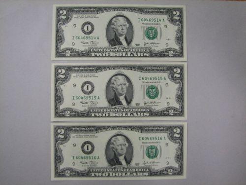 Three 2003 Uncirculated Two Dollar Bill in protective case with certificate of authenticity, Consecutive serial numbers. Condition: Mint.