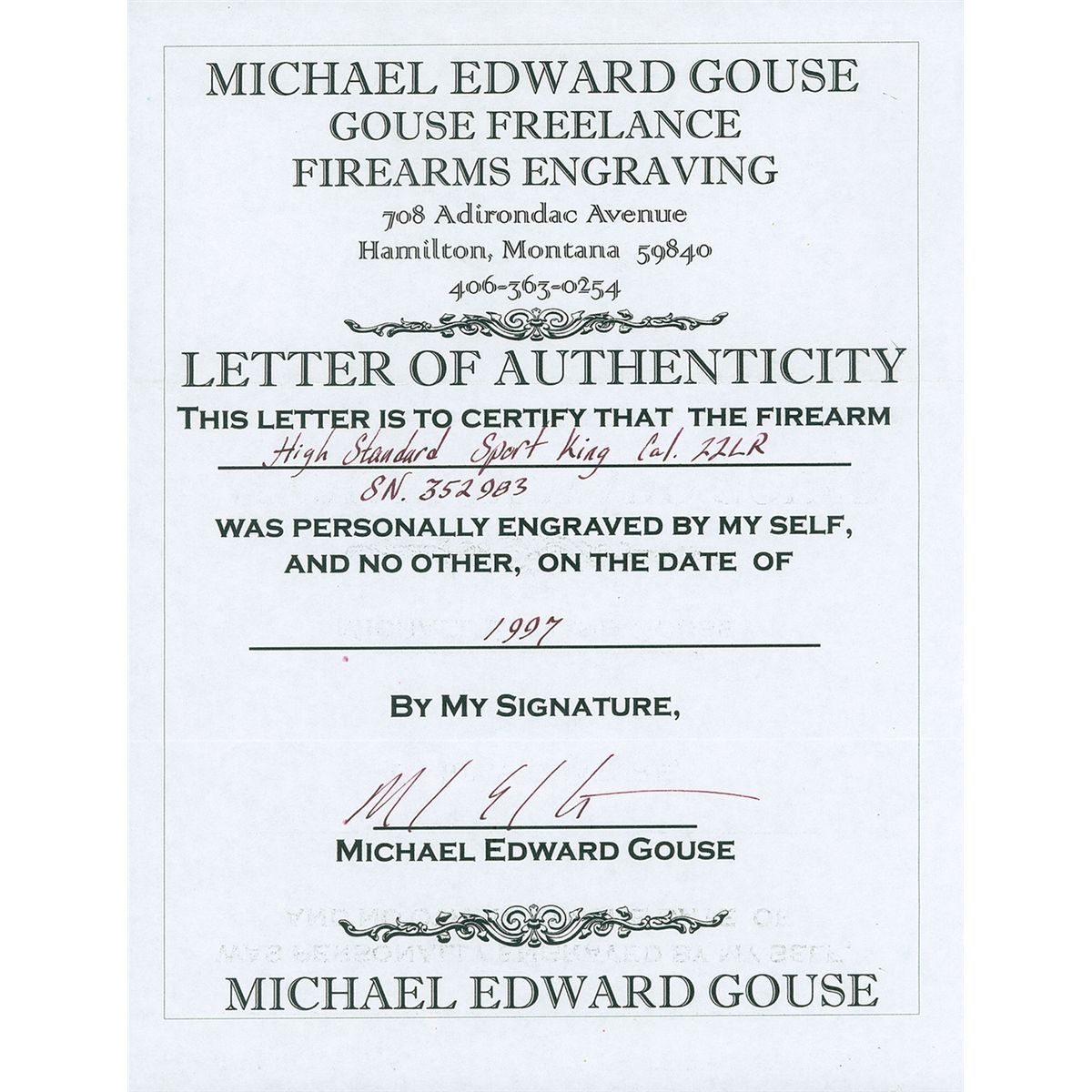 Engraved by Michael Gouse of Montana. With unnumbered box, 4 1/2" barrel, also engraved.