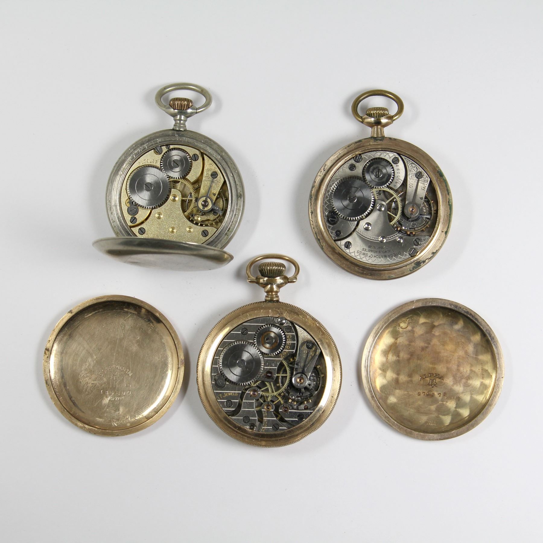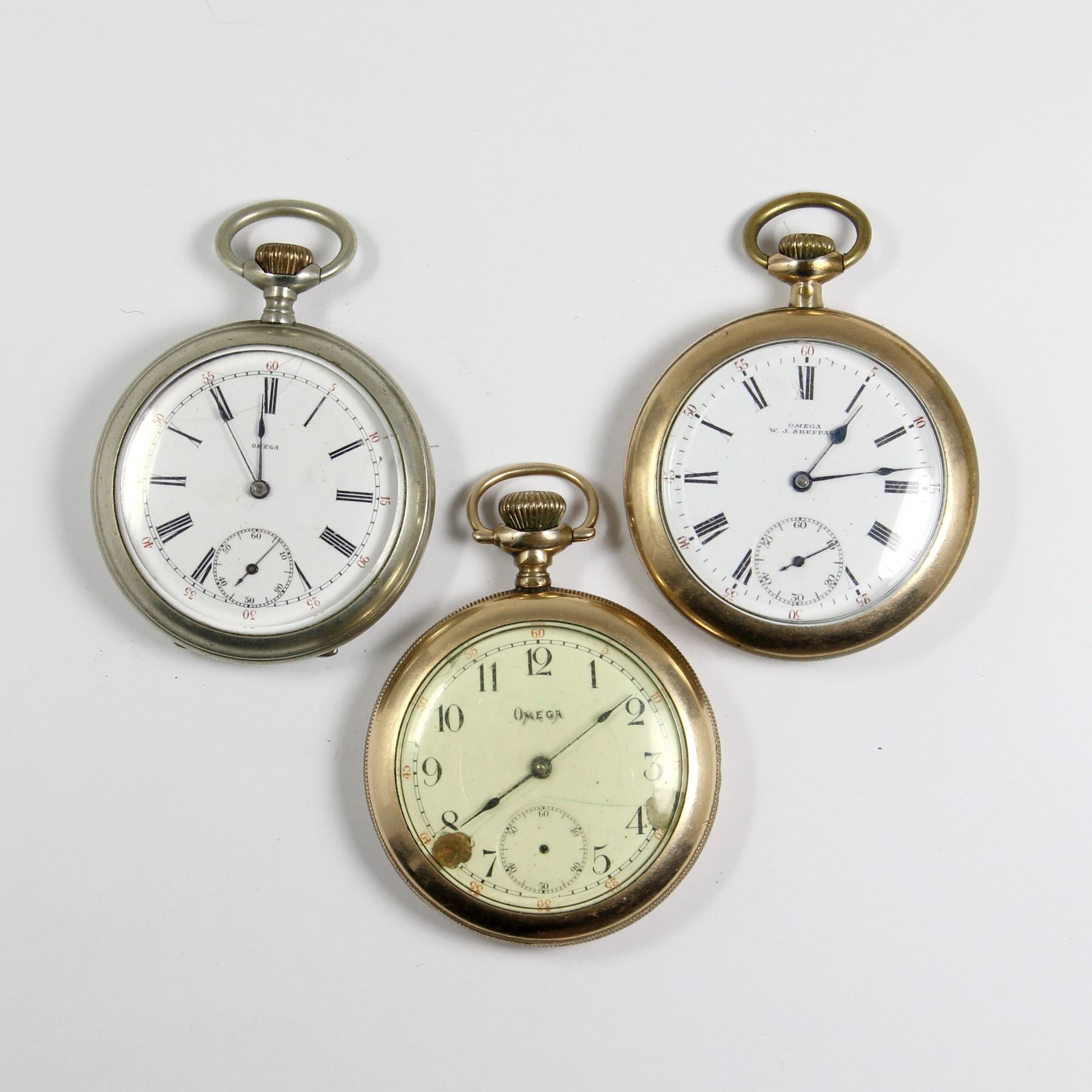 Three (3). Swiss. 1910s. Omega Watch Co. Cases: Gold filled and Nickel Silver. Marked, "Omega", "Alpha" and unknown gold filled. 16 size (43mm movement diameters). One dial marked, "Omega W.J. Sheppard". Two running, one not running. The watch that is not running is missing its seconds hand and has a dent in the side of the case which prevents it from being opened. Running watches have not been tested for timekeeping accuracy and may require adjustment. The fact that a watch has been described as "running" provides no guarantee of its ability to continue to do so.
