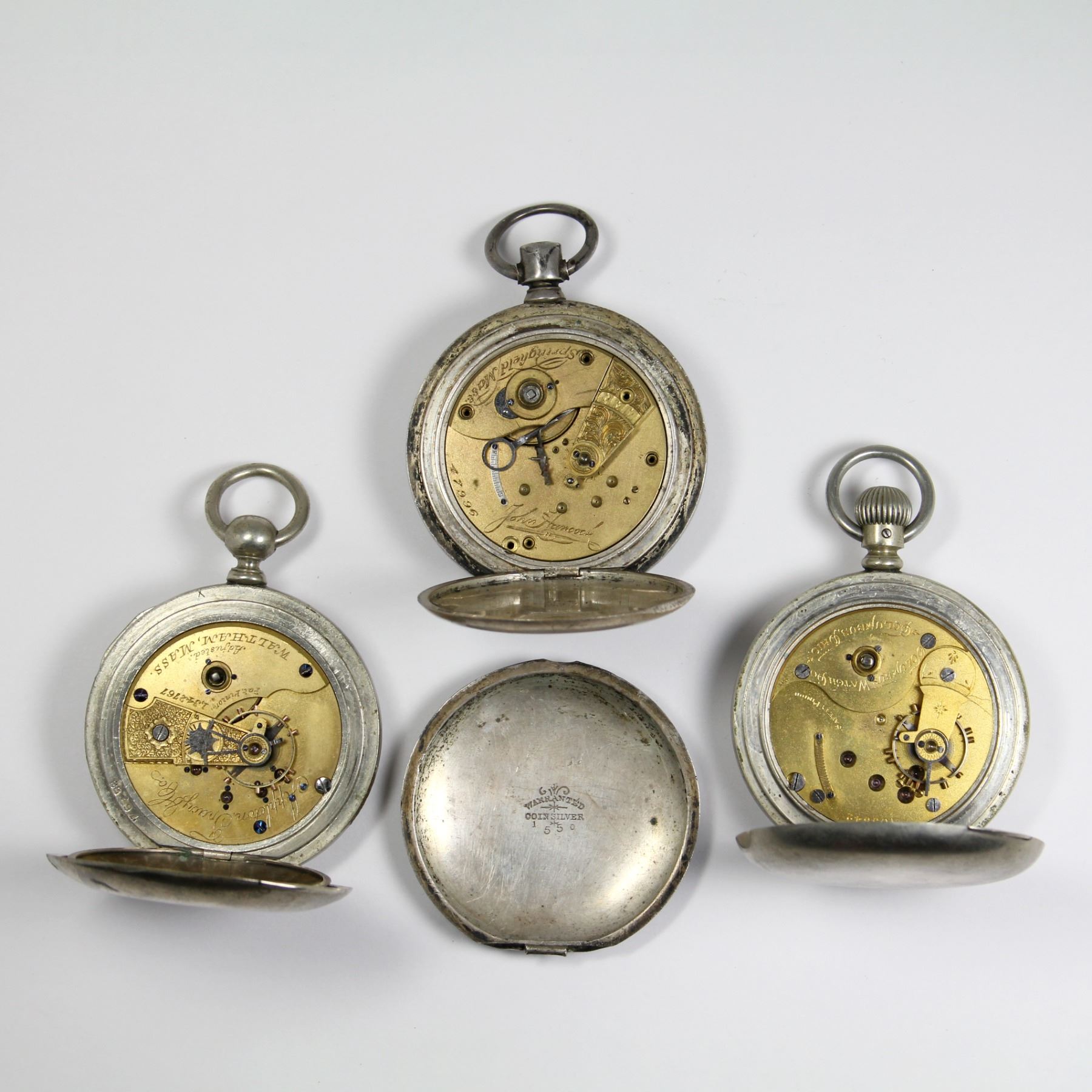 Three (3). American. New York Watch Company, Columbus Watch Company and American Watch Company (Waltham). Cases: Coin silver and nickel silver. Coin silver case marked, "Warranted Coin Silver". Nickel silver cases marked, "Silveroid" and "Dueber Silverine Canton O". 18 size (45mm movement diameters). The New York Watch Co. example is marked, "John Hancock" serial # 47996. Each not running. The Appleton, Tracy & Co. has a broken balance staff and loose crystal. The Columbus is wound tight and will not run. The New York Watch Co. example is missing its escape wheel, pendant and possibly other parts. The rear case is detached at the hinge. Running watches have not been tested for timekeeping accuracy and may require adjustment. The fact that a watch has been described as "running" provides no guarantee of its ability to continue to do so.