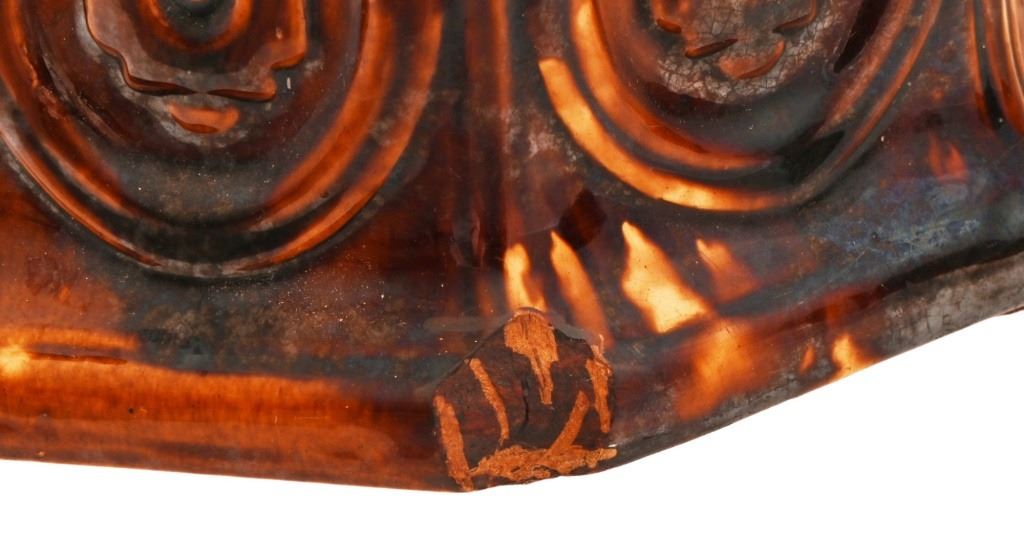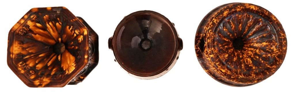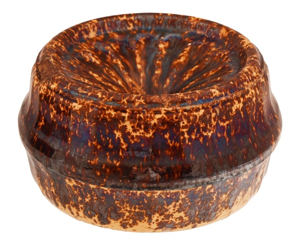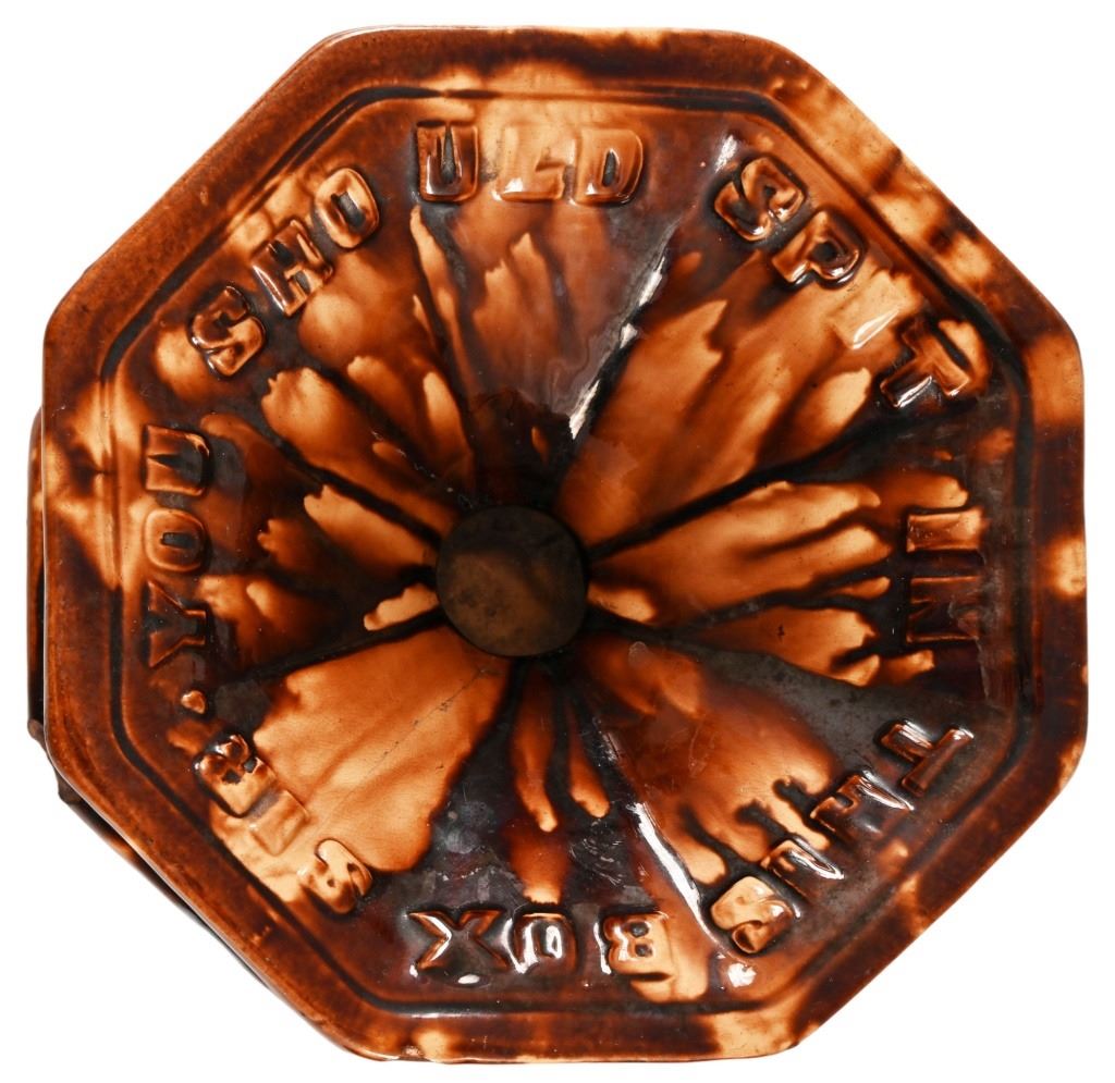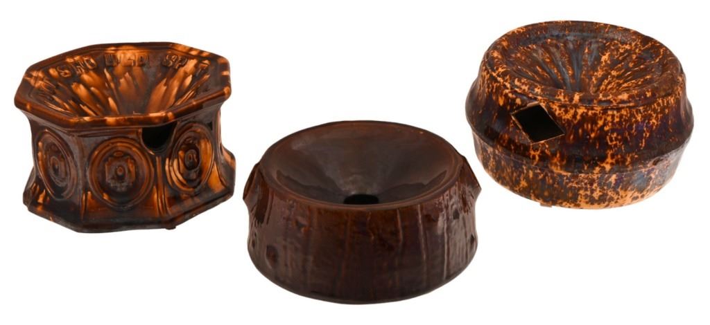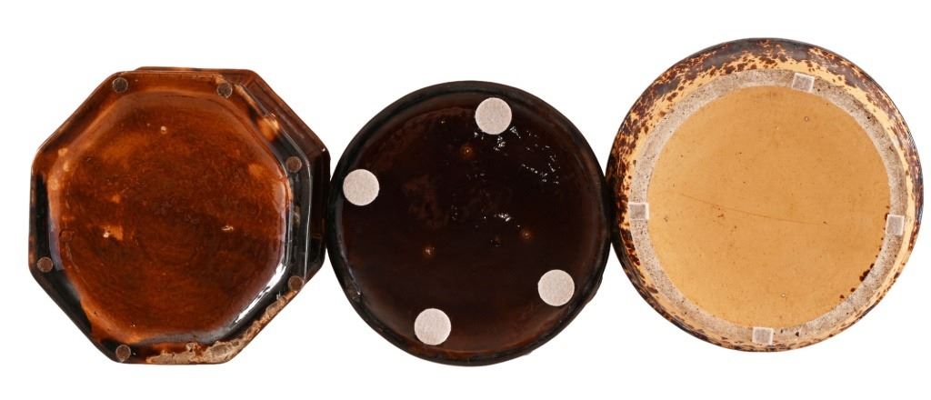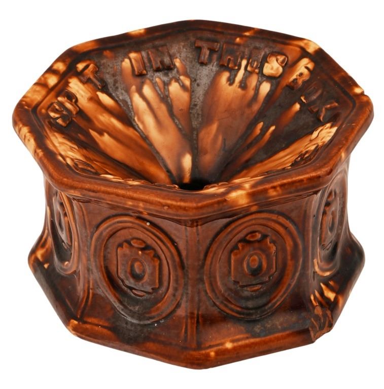 One (1) Made to look like a tree log. Measures 3.25" x 8". One (1) Antique Bennington Spittoon Ceramic Cuspidor. Script on top reads "THIS BOX SIR, YOU SHOULD SPIT IN". Measures 4.75" tall x 8" diameter. Bottom has some chipping, with felt protectors added to prevent any further. One (1) Antique Bennington Spittoon Ceramic Cuspidor Measures 5" tall x 9" diameter.