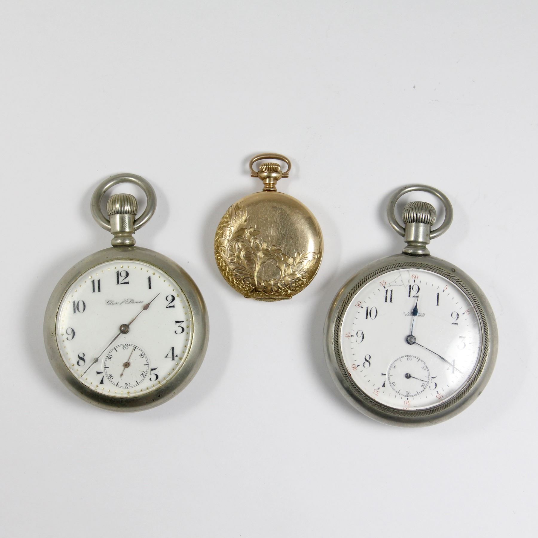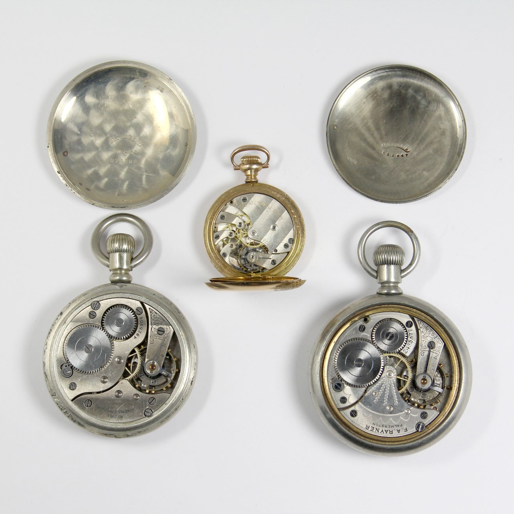 Three (3). Swiss. Class & Stoner (movement marked "Regina", Thomas Lees, Hamilton, Ontario, F.A. Rayner, Palmerston, Ontario. Cases: Nickel silver and gold filled. Marked, "Dueber Special G.F", "Silveroid" and "Silveroid A.W.C. Co.". Two (2) 18 size (45mm movement diameters) and 0 size (29.63mm movement). Each not running. The 0 size watch is missing its crystal. Running watches have not been tested for timekeeping accuracy and may require adjustment. The fact that a watch has been described as "running" provides no guarantee of its ability to continue to do so.
