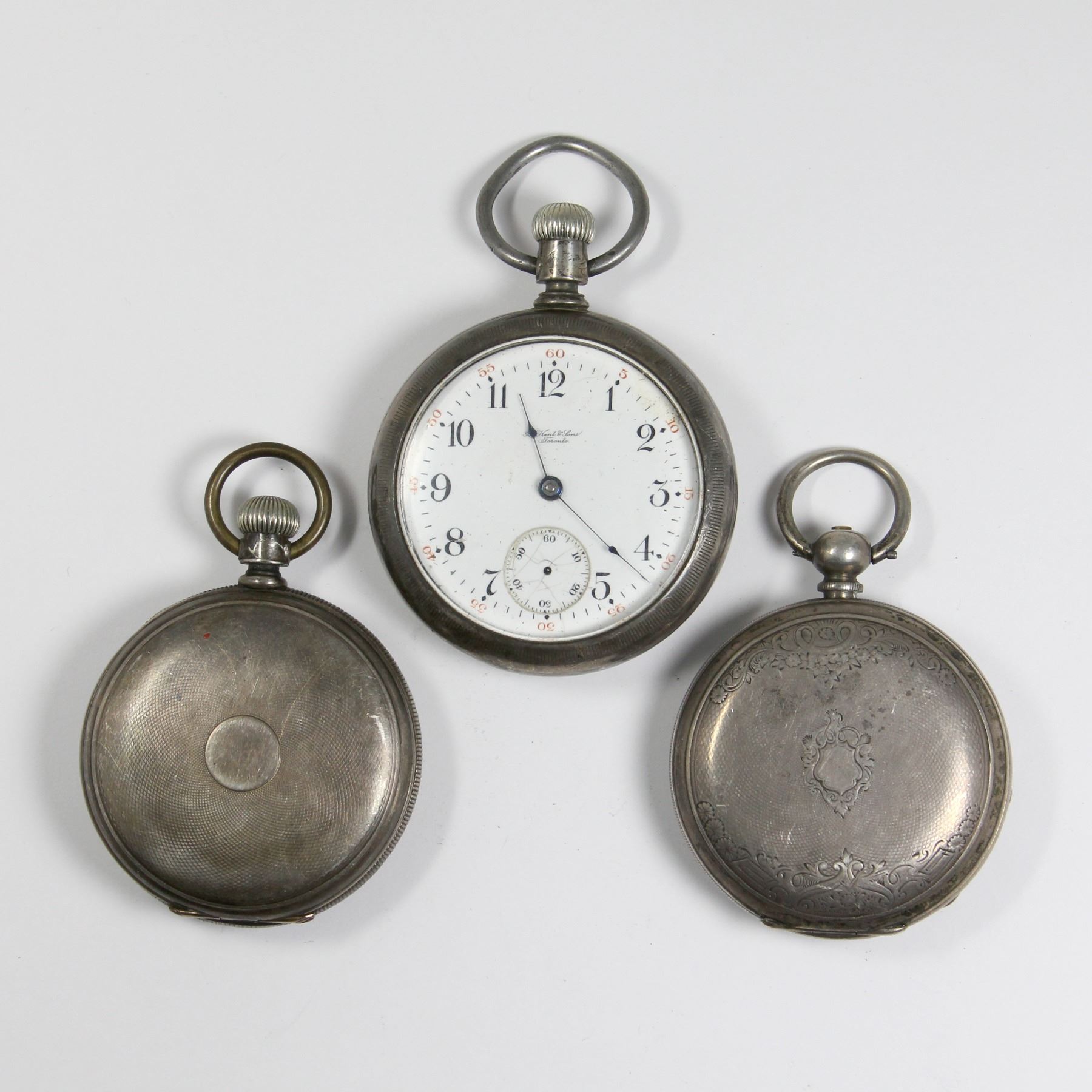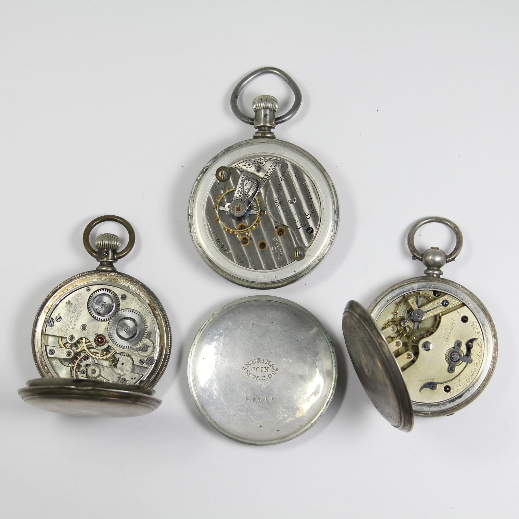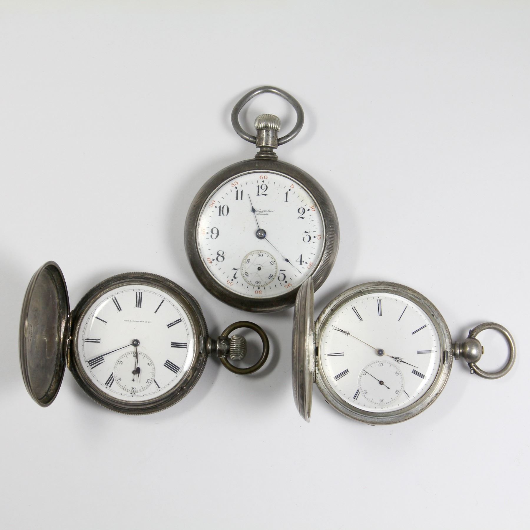 Three (3). American and Swiss. 1870s-1890s. Branded, "A. Kent & Sons, Toronto" (Illinois), "S.F. Shute, Fredericton, New Brunswick" (Swiss), and "George G. Robinson & Co" (Swiss). Cases: Coin silver. Marked, "Fine silver", "A.W.W Co. Waltham Coin", and "Regina Coin M.W.C. Co.". 18 size (45mm movement diameters). One keywind, two pendant wind. The Kent Brothers watch is running, the other two are not. The Robinson watch has a broken balance staff and may be missing parts. The Shute is wound tight. Running watches have not been tested for timekeeping accuracy and may require adjustment. The fact that a watch has been described as "running" provides no guarantee of its ability to continue to do so.