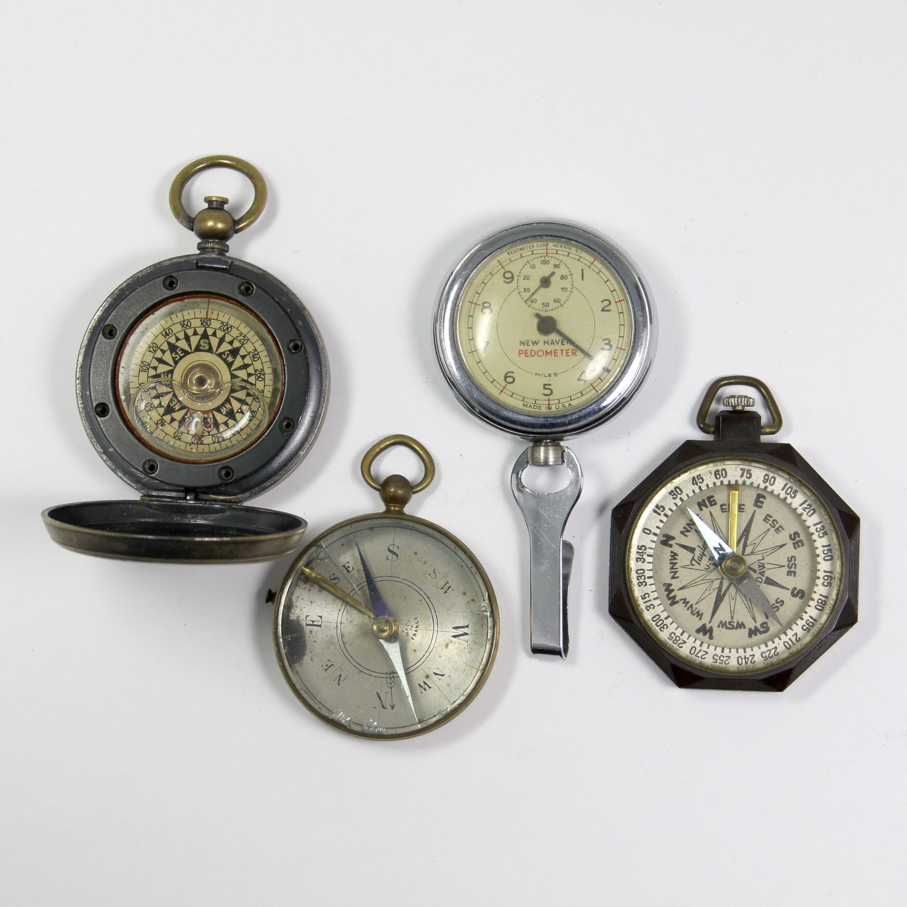 Four (4). English, American and French. 1910s-40s. Pedometer Corp, Newark, N.J "New Haven Pedometer", Taylor Leedawl, England, and "Made in France" Cases: Brass, bakelite and chrome. 46mm to 52mm case diameters. The hunting case compass features luminous directionals and a quality that may suggest military use. The open face compass has a cracked glass. Running watches have not been tested for timekeeping accuracy and may require adjustment. The fact that a watch has been described as "running" provides no guarantee of its ability to continue to do so.