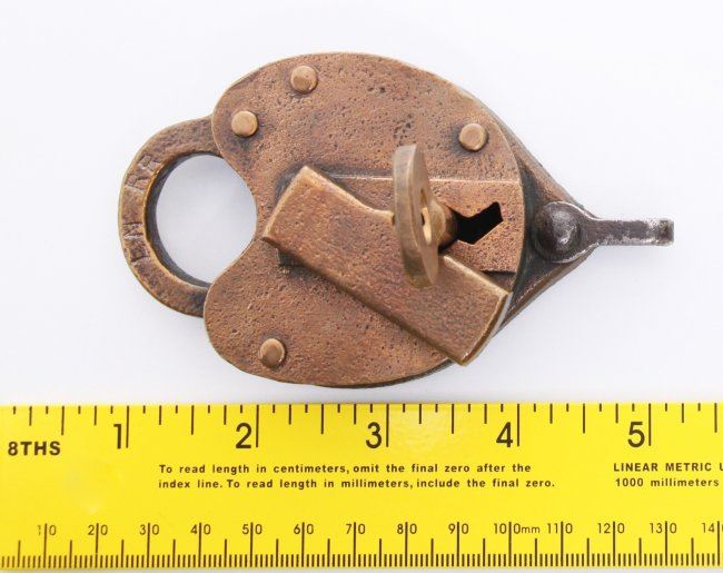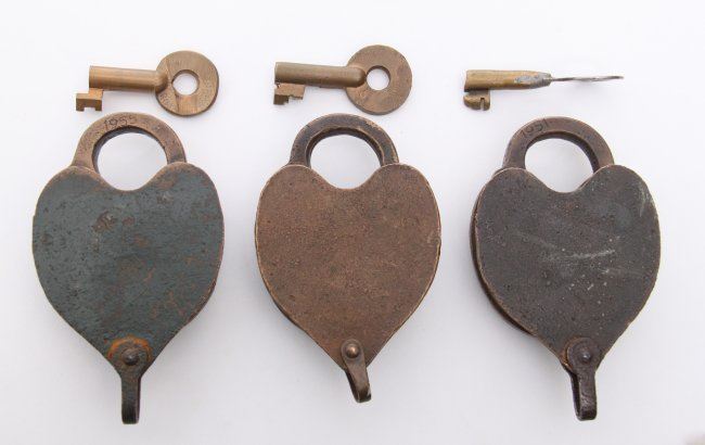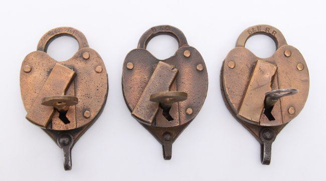 Three(3) Vintage rail road heart shape locks. Markings: LN RR, B&O, S&W RR SIZE: see attached ruler photo. Photos are part of the description representing the condition report and can be used for authentication prior to the sale date. Pangaea Auctions urges Bidder's to view all attached photos in detail.