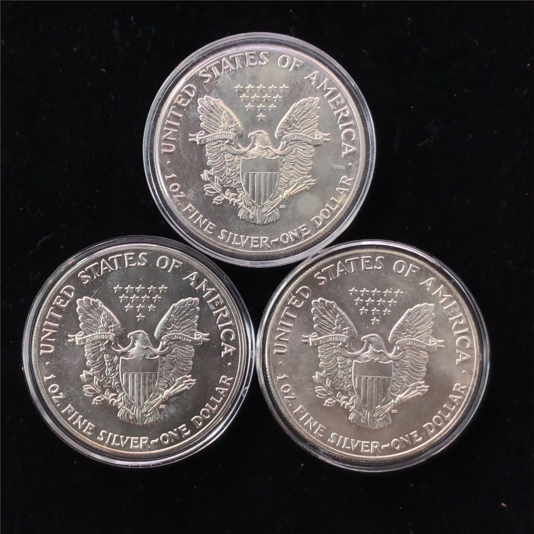 A group of Three (3CT)1986 1987 and 1988& nbsp; Uncirculated American Silver Eagle Dollars the First Three Eagles Issued. Beautiful snow white uncirculated American Silver Eagles, like the day they were made, in Exact fit holders. A fun way to buy some silver and start a set& nbsp; & nbsp;