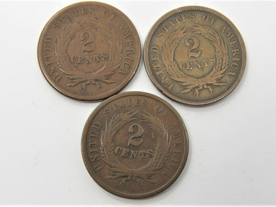A nice group of Three (3ct) US 1864 Two Cent Pieces in VG-F condition.