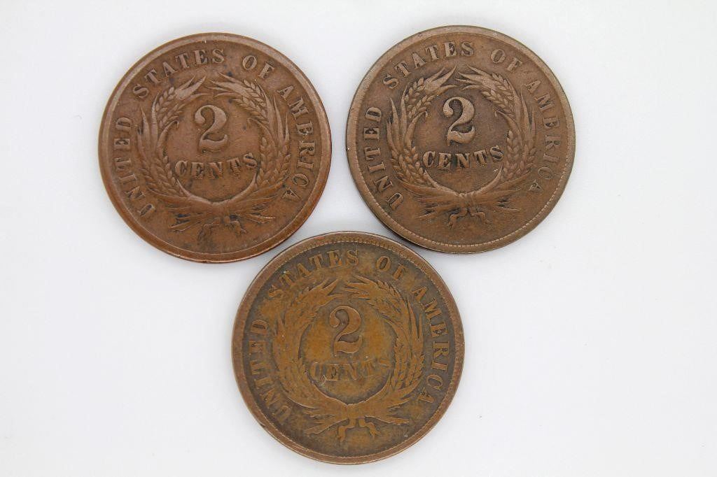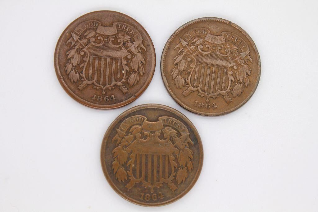 A nice group of Three (3ct) US 1864 Two Cent Pieces in VG-F condition.