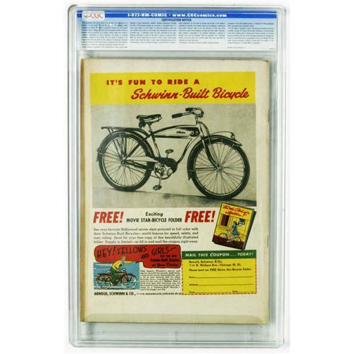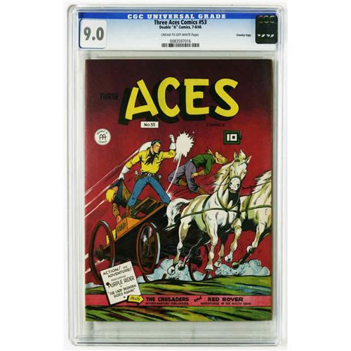 <B>Three Aces Comics #53 Crowley Copy pedigree (Double "A" Comics, 1946) CGC VF/NM 9.0 Cream to off-white pages.</B></I> A Golden Age comic that's not listed in Overstreet? Believe it! This is a Canadian comic published by Anglo-American (the "double A" of the logo), a publisher perhaps best known for publishing the Canadian editions of Fawcett comics. That in turn explains how Fawcett editor Wendell Crowley acquired a copy for his collection. If you missed issues #1-52, join the club, and if you have #1-52, give us a call! CGC census 12/05: 1 in 9.0, none higher.