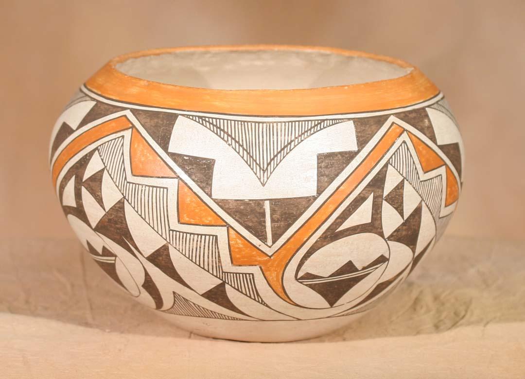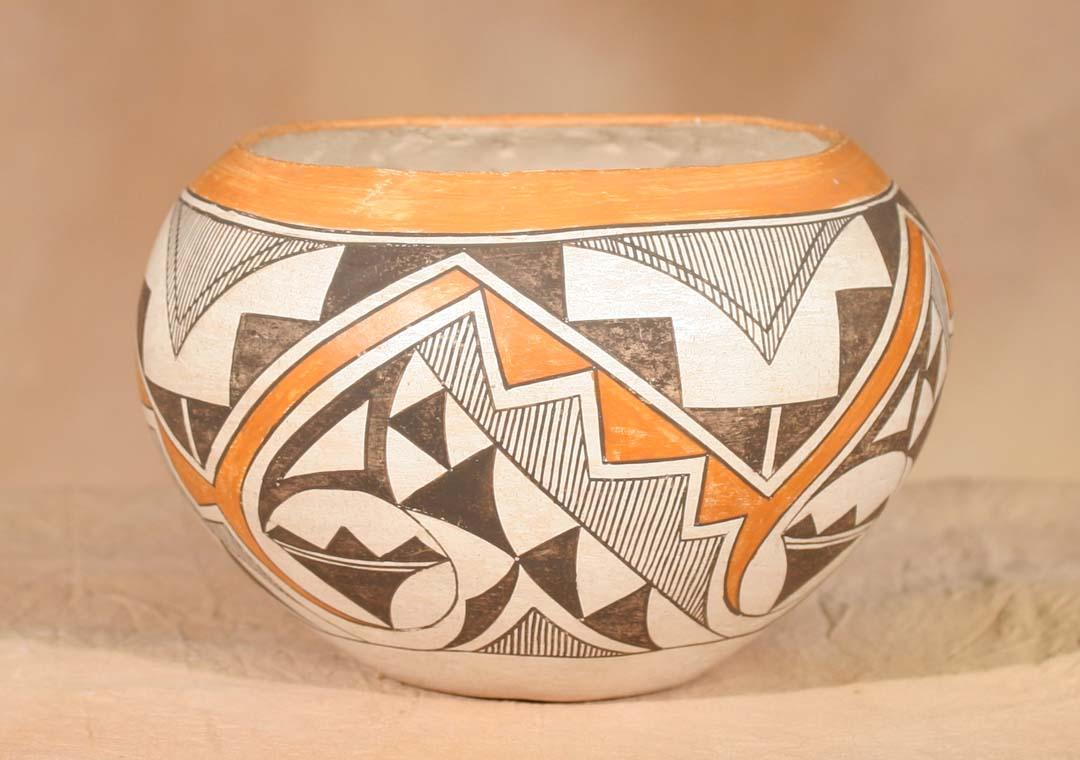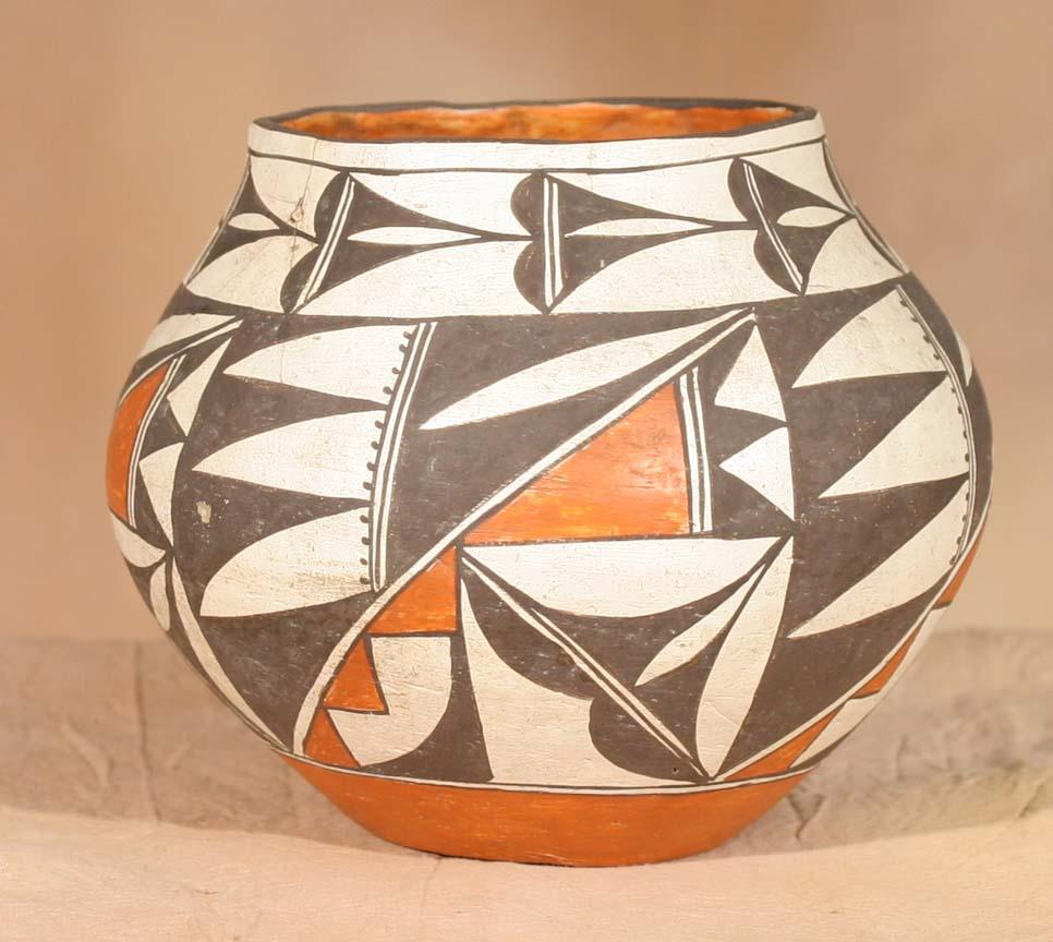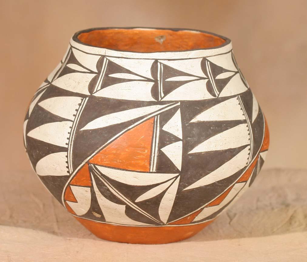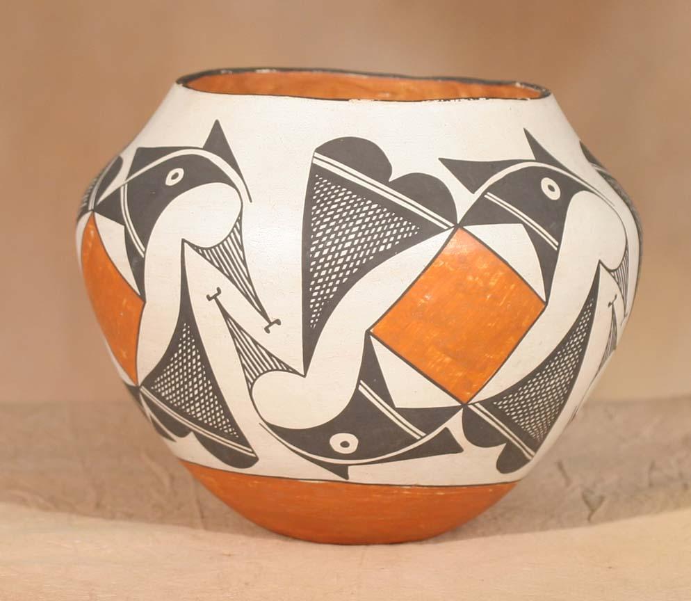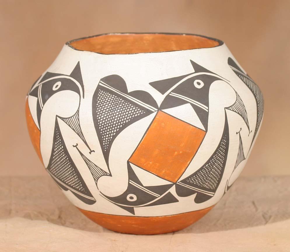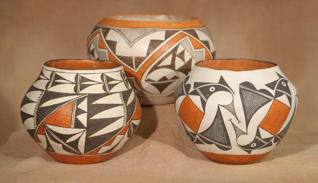 Three Acoma Pots. a) 8" x 6 ½" parrot designs, circa 1940. b) 7 ½" x 6 ¼" geometric designs, circa 1920s. c) 9" x 6" geometric designs, circa 1920s. All polychrome painted. (est $1,200-1,800). For condition reports please visit: www.auctioninsantafe.com/cr2011.pdf