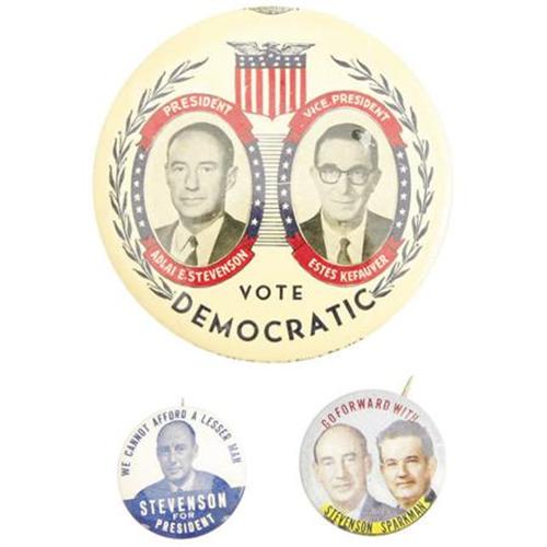 <B><B>Lot of Three Adlai Stevenson Presidential Campaign Buttons,</B></I></B></I> including: a large 1956 Stevenson and Estes Kefauver jugate, 3 ½”; a 1952 Stevenson and James Sparkman color jugate, 1 ½”; and, a “We Cannot Afford A Lesser Man” Stevenson button, 1 ¼”. All near fine or better.<BR><BR><BR><b>Shipping:</b> Miscellaneous Collectibles, Smal (<a target="_blank" href="http://www.heritageauctions.com/common/shipping.php">view shipping information</a>)
