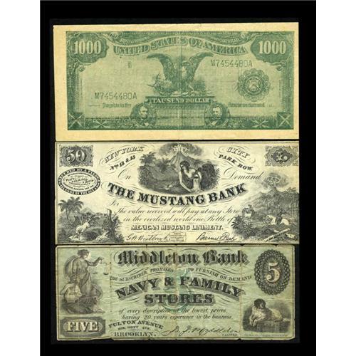 <B>Three Advertising Notes.</B></I><BR><B>Brooklyn, NY- Navy & Family Stores</B></I> circa 1870s Ad Note <B>VG, edge splits</B></I><BR><B>New York, NY- Mexican Mustang Liniment</B></I> circa 1870s Ad Note <B>VF</B></I><BR><B>Berlin Germany- Otto Lentz</B></I> circa 1920s Black Eagle Face look-alike ad note <B>Fine.</B></I><BR>The final note in this trio is for a German shoe store. A United States Black Eagle look-alike note was a favorite advertising ploy of German merchants during the 1920s.