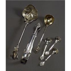 the dominical letter F and the purity mark 11/12. Dents to bowl of Medallion ladle; repair to sugar tongs; damage to one salt spoon.